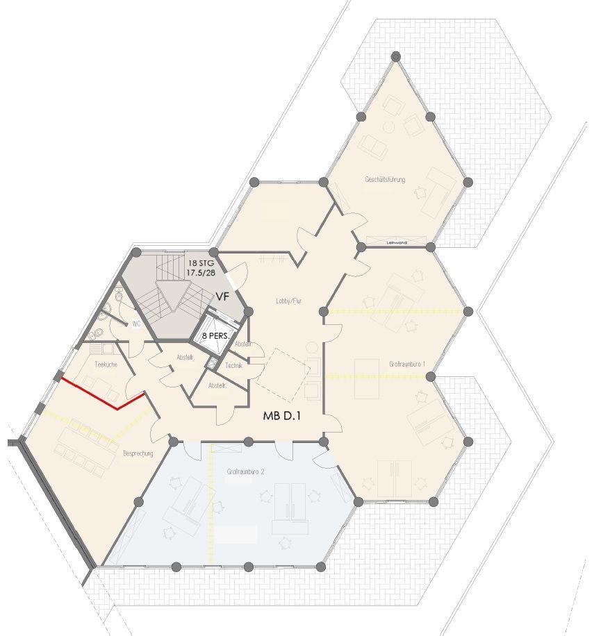 Die Bürofläche ist ist derzeit unterteilt in ein Großraumbüro mit ca. sieben Arbeistplätzen, zwei Einzelbüros, einen Konferenzraum, eine Teeküche, eine Toilettenanlage sowie Abstell-, Service- und Kopieräume. Hinzu kommt ein Eingangs- und Lopbbybereich für den Empfang. Die Aufteilung ist flexibel und kann ebenso wie die gesmate Austattung den Anforderungen des neuen Mieters angepasst werden.