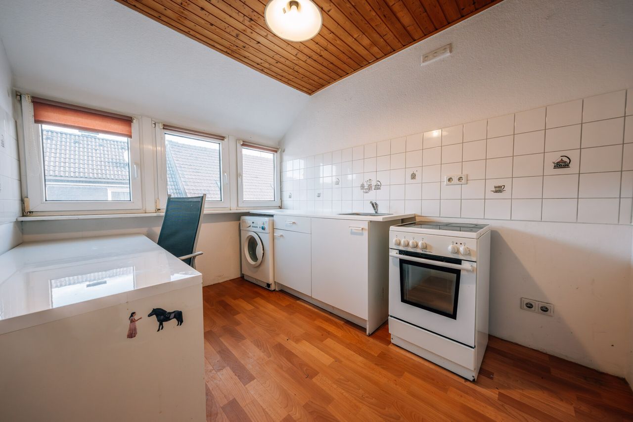 Diese Dachgeschosswohnung verbindet urbanes Leben mit ruhiger Rückzugsmöglichkeit auf rund 68 m² Wohnfläche. Über den zentralen Flur gelangen Sie in alle Räume: ein großzügiges Schlafzimmer, ein wohnlicher Wohnbereich, ein flexibles Büro, die funktionale Küche und ein modernes Tageslichtbad mit Dusche – alles durchdacht angeordnet und vielseitig nutzbar.