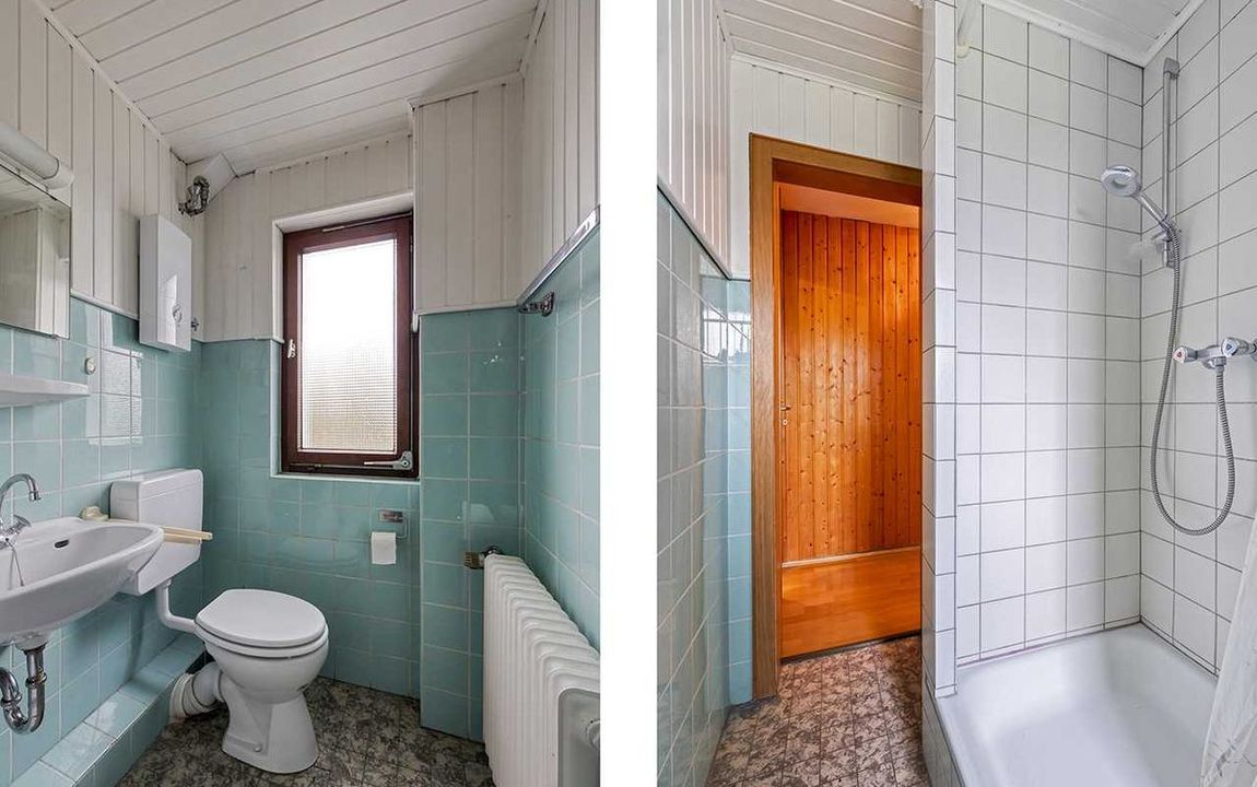 Die beiden Duschbäder in den Etagen sind braun beziehungsweise türkis/grau gefliest und verfügen jeweils über Fenster.