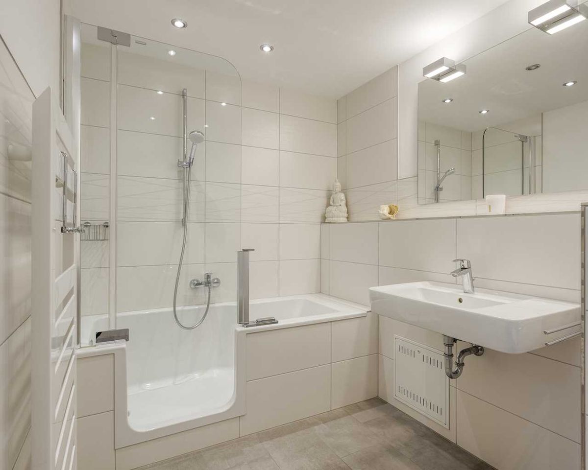 Das geräumige Badezimmer wurde 2020 saniert, ist mit weißen Wand- und grauen Bodenfliesen ausgestattet und verfügt über eine Badewanne mit niedrigem Eintritt.