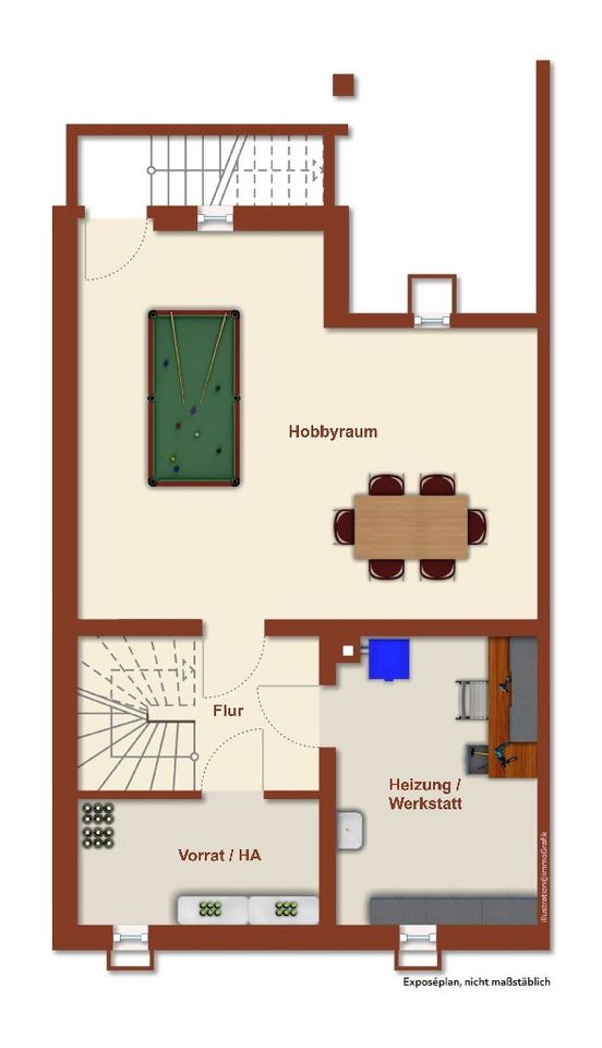 Aufgrund der Vollunterkellerung des Hauses finden Sie auch im Untergeschoss noch attraktive Flächen vor, die u. a. durch einen Hobbyraum (ehem. Partykeller) belegt werden können. Aus diesem Raum führt eine Ausgangstreppe gartenseitig zur Terrasse und auf das Grundstück. Außerdem stehen noch ein Vorratskeller mit den Hausanschlüssen sowie eine Waschküche/Werkstatt zur Verfügung.