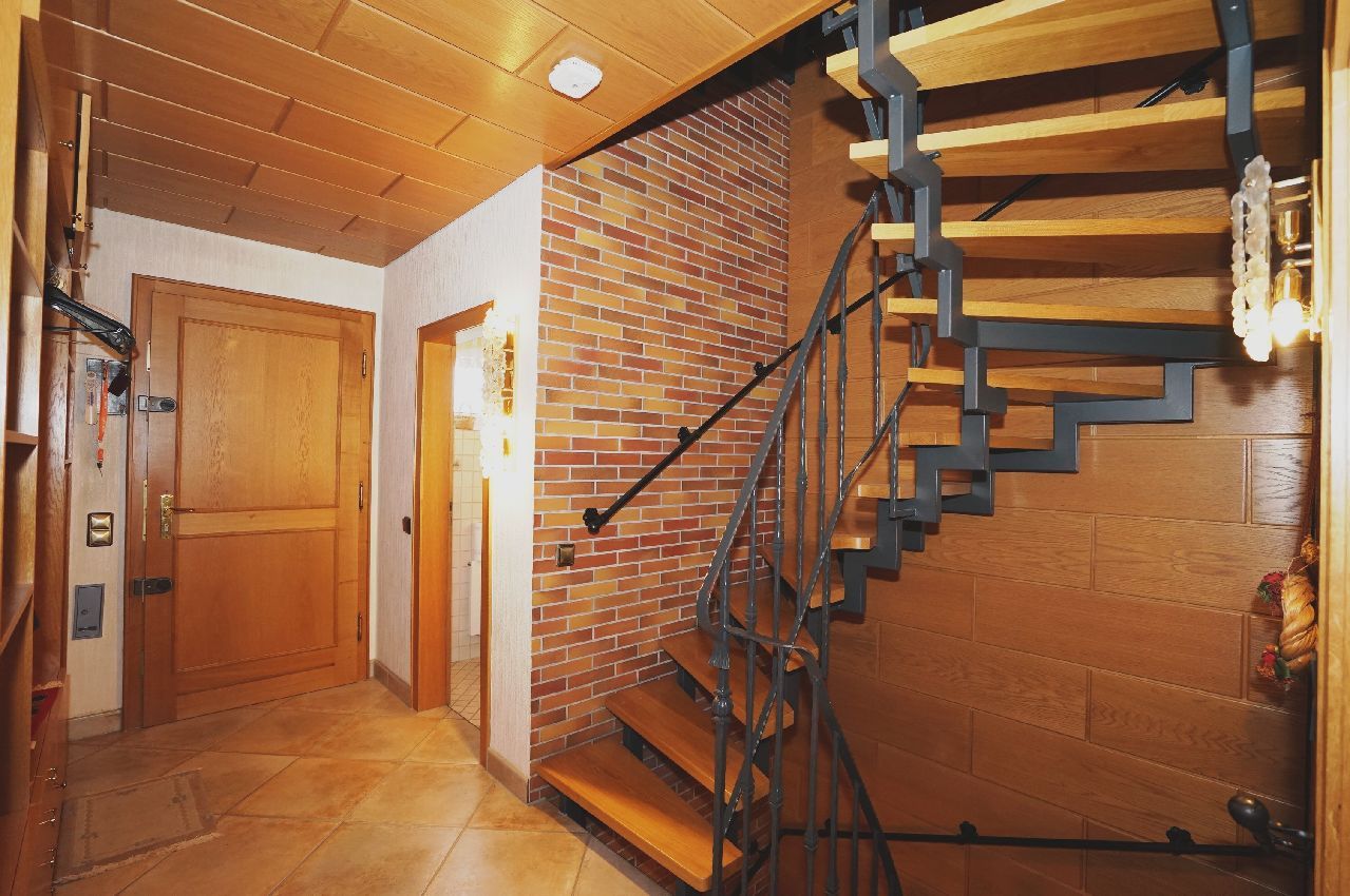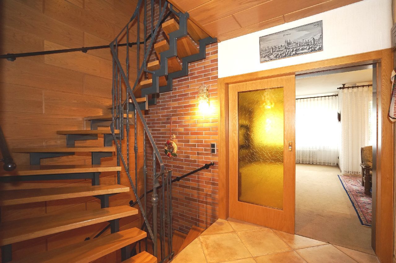 Über einen mit Bruchsteinplatten belegten Hausvorplatz erreichen die überdachte Hauseingangstüre. Anschließend betreten Sie die Eingangsdiele mit Garderobe und Gäste-WC. Außerdem befinden sich hier die Zugänge zur Küche und in das Wohnzimmer sowie die alle Etagen miteinander verbindende Innentreppe. Diele und Küche sind gefliest, und das über eine Doppelschiebetüre mit Glaseinsatz erreichbare Wohnzimmer ist mit Teppichboden ausgestattet.