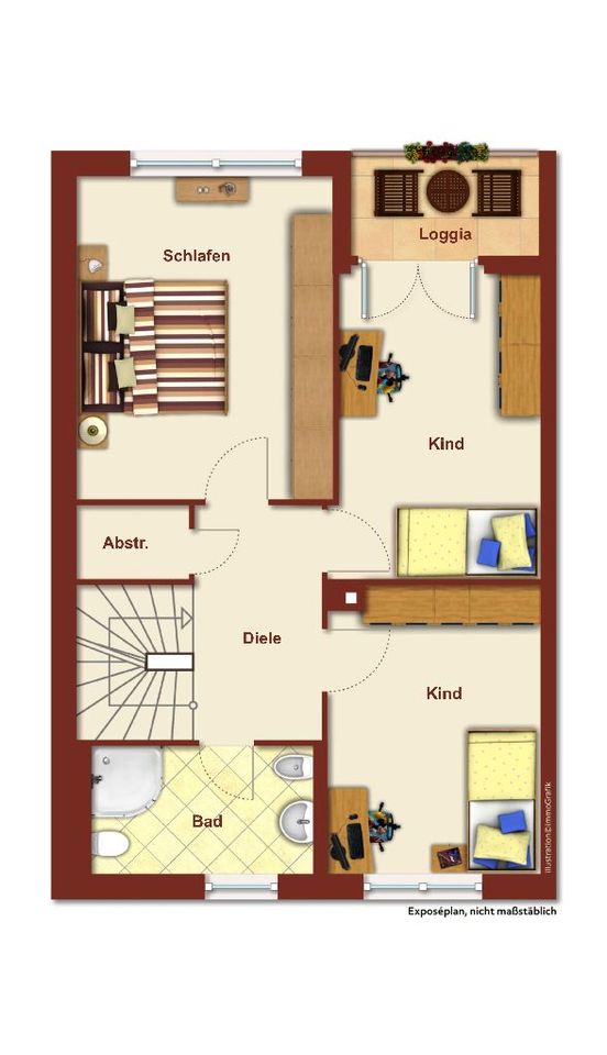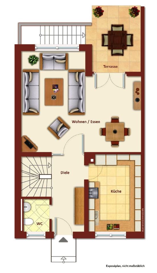 Grundrisse: Bei den in den Grundrissplänen (Prospektzeichnungen) eingezeichneten Möbeln und Ausstattungsgegenständen (z. B. Waschmaschine, Trockner, Sanitärausstattung, o. Ä.) handelt es sich um Einrichtungs- und Gestaltungsvorschläge, die nicht mit den vor Ort vorhandenen Gegebenheiten übereinstimmen müssen. Sie sind kein Bestandteil des Angebotes, und somit ohne konkreten Hinweis nicht im Kaufpreis enthalten. Sie dienen lediglich der Darstellung der Lage und ungefähren Größe der Räumlichkeiten. Für eventuell eingetragene Maße übernehmen wir keine Gewähr.