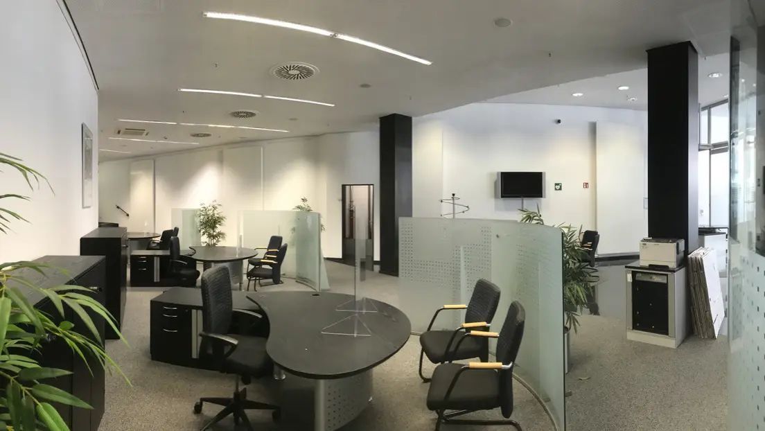 Hochwertiger Granitboden (schwarz), qualitativer Teppichboden in der Mietfläche, Abhangdecke, WC-Anlagen, Raumaufteilung (teilweise inkl. Einbauten), Kabelkanäle, Beleuchtungen, Klimaanlage können bei Bedarf übernommen werden, Fernwärme.
