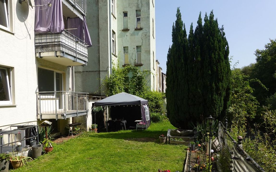 Außenanlagen: Rückseitiger Gemeinschaftsgarten mit Südausrichtung und Blick auf die Ennepe