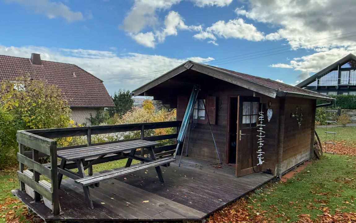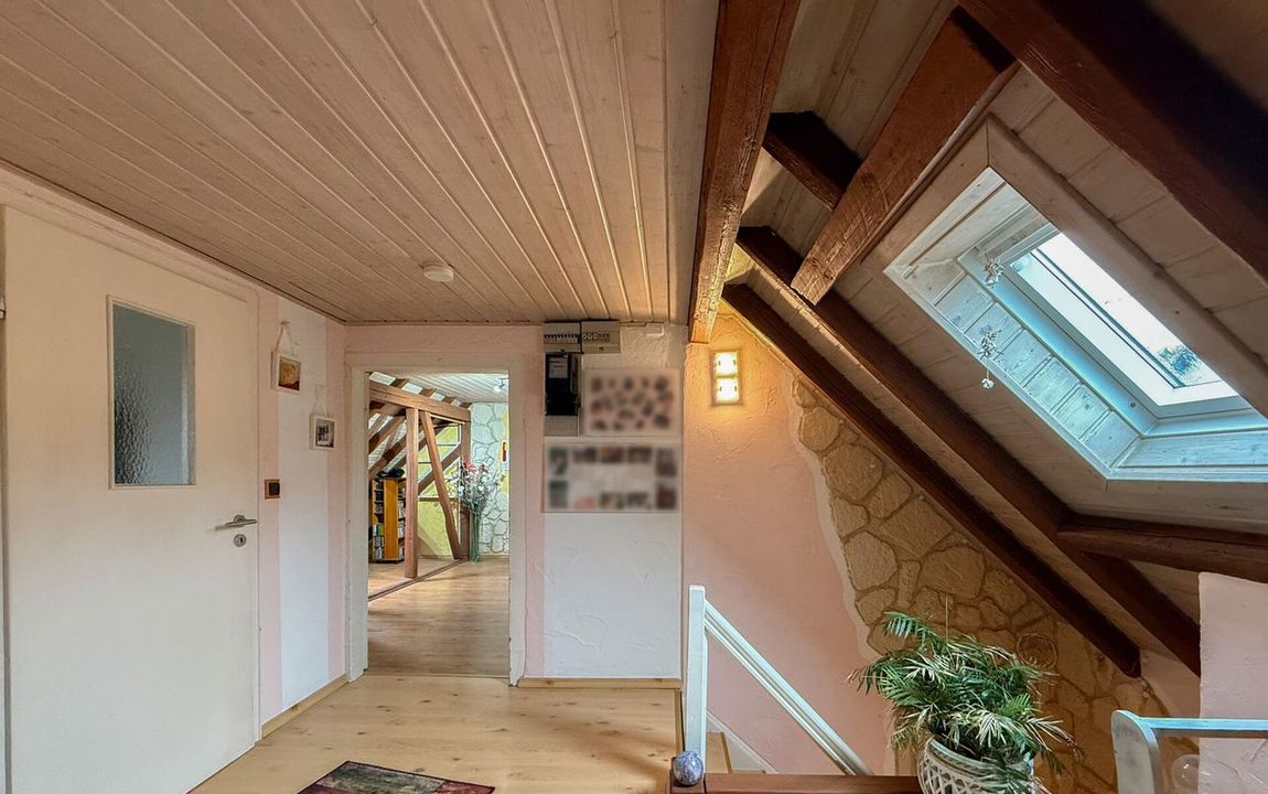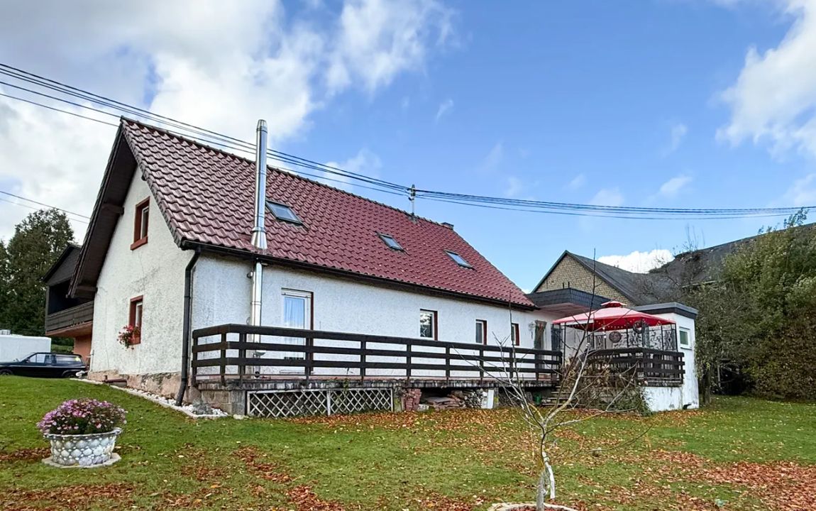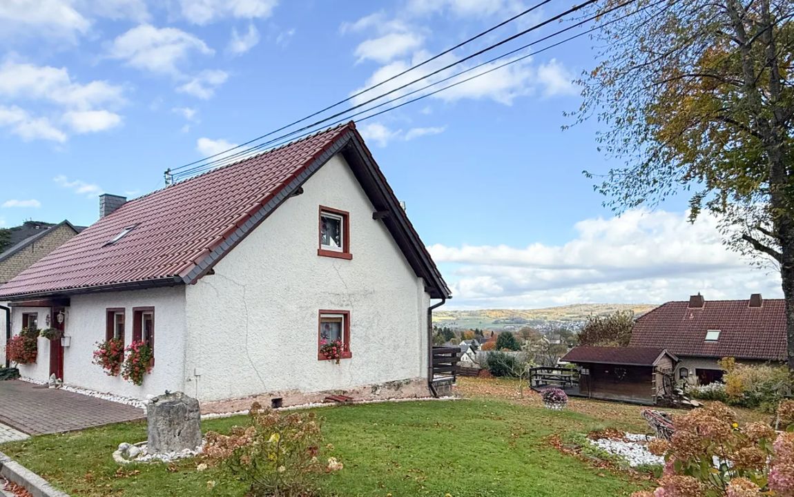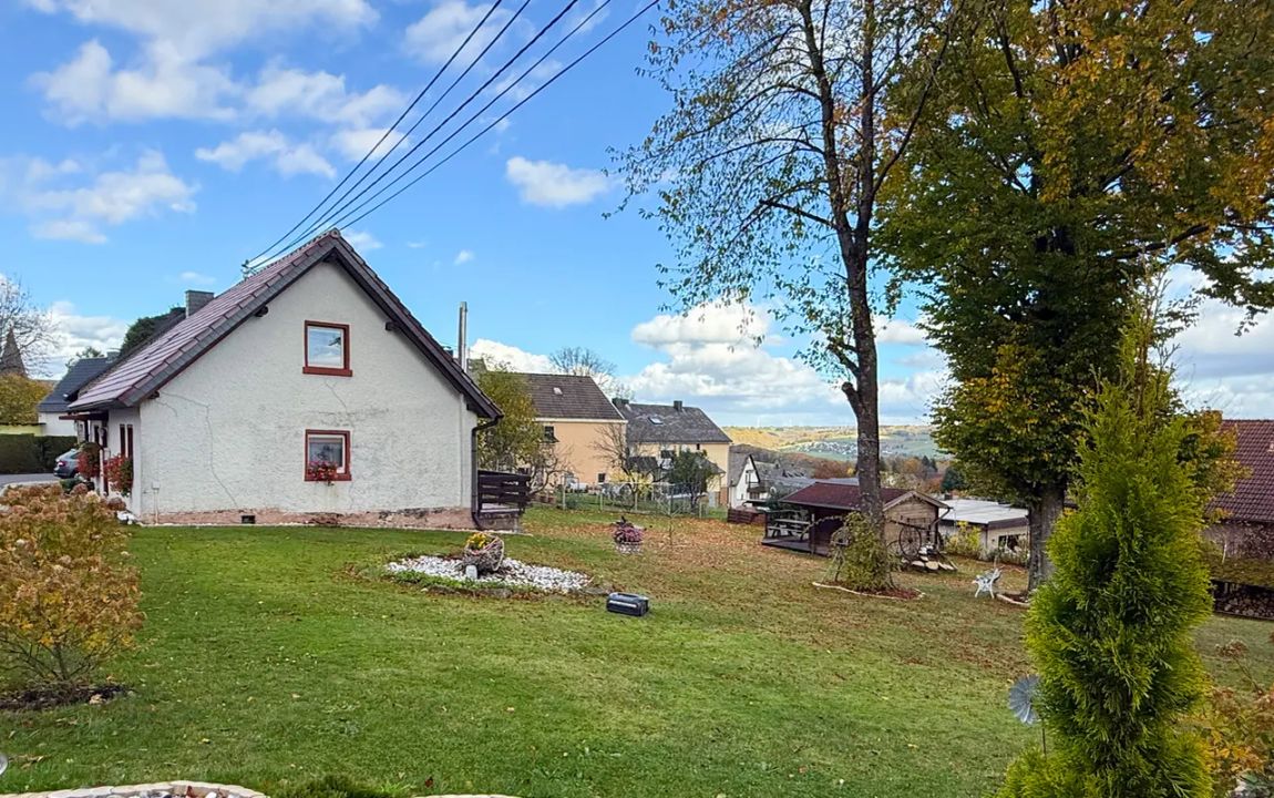 Dieses charmante Einfamilienhaus aus ca. 1914 befindet sich in herrlicher Höhenlage auf einem großzügigen Grundstück von rund 1.219 m², das sich bei Bedarf auch in einen separaten Bauplatz aufteilen ließe. Das Haus präsentiert sich gepflegt und bietet eine Wohnfläche von etwa 132,41 m², die sich über Erd- und Dachgeschoss erstreckt. Im Erdgeschoss empfängt Sie ein großer Wohnbereich mit Kaminofen, von dem aus Sie sowohl den Balkon als auch den Garten erreichen. Das Esszimmer liegt direkt neben der Küche, welche ebenfalls über einen Zugang zum Balkon verfügt. Ein helles Tageslichtbad mit Wanne und Dusche sowie ein weiteres Zimmer, vervollständigen diese Ebene. Die Raumaufteilung ermöglicht komfortables Wohnen auf einer Ebene und eignet sich damit auch hervorragend für das Wohnen im Alter. Im Dachgeschoss stehen zwei Schlafzimmer und ein kleiner Raum, der sich als Büro oder Abstellfläche eignet, zur Verfügung. Der Spitzboden bietet zusätzlichen Stauraum. Eine Einzelgarage mit elektrischem Tor sowie ein Kriechkellerraum sind ebenfalls vorhanden. Das gepflegte Grundstück mit Baumbestand, Gartenhäuschen und beeindruckendem Fernblick macht dieses Zuhause besonders attraktiv. Der Ort selbst besitzt eine eigene Kindertagesstätte und eine Grundschule – ideal für Familien.
