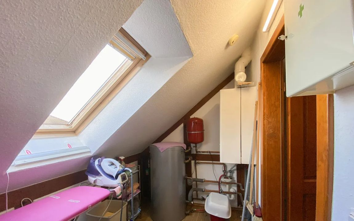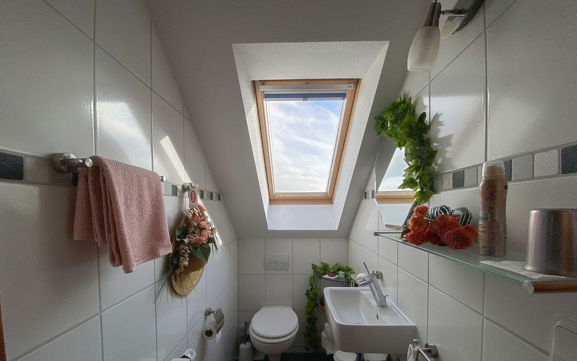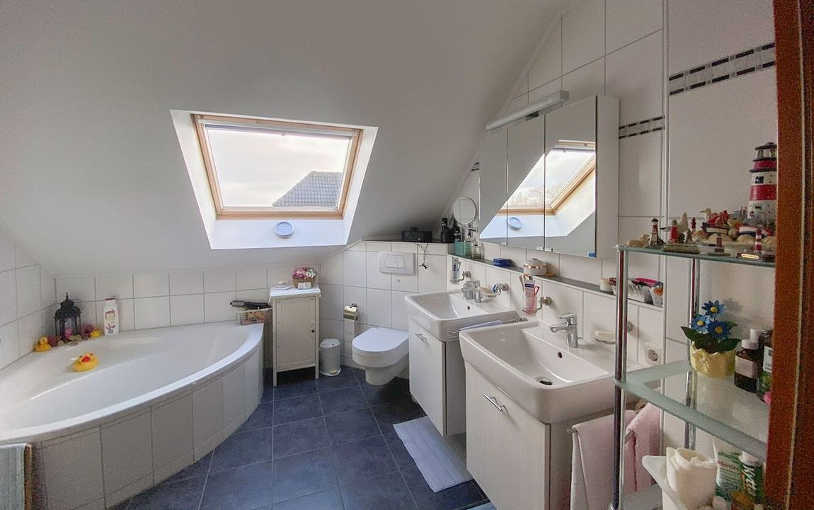 Im Obergeschoss befinden sich zwei Schlafzimmer, ein Badezimmer mit Fußbodenheizung sowie ein weiteres Gäste-WC. Ein zusätzlicher, kleiner Raum bietet sich hervorragend als Bügelzimmer oder individueller Arbeitsbereich an. Abgerundet wird das Obergeschoss durch einen ansprechenden Parkettboden.
