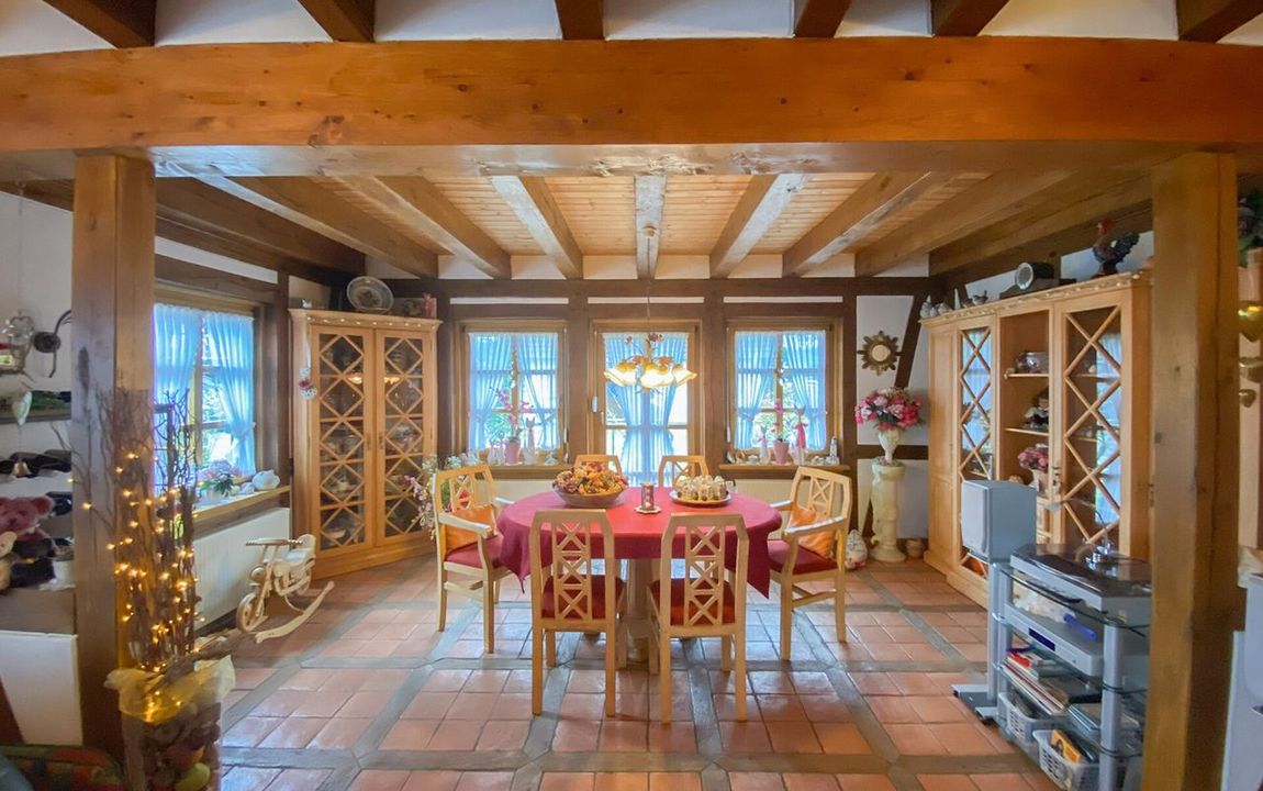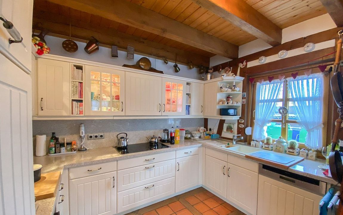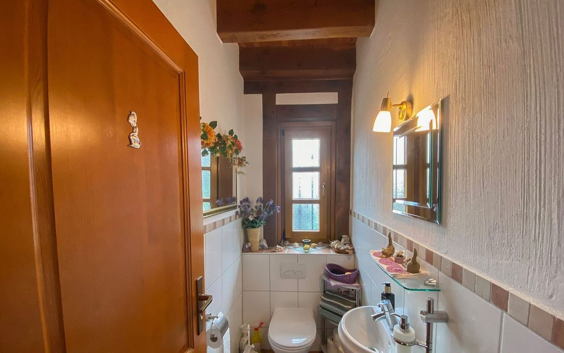 Im Erdgeschoss empfängt Sie eine einladende Diele, ein großzügiger Wohn- und Essbereich sowie die Küche, ausgestattet mit einer hochwertigen Einbauküche im Landhausstil, die auf Wunsch gegen Aufpreis übernommen werden kann. Der wunderschöne, terracottafarbene Natursteinboden im gesamten Erdgeschoss verleiht den Räumlichkeiten eine besondere Tiefe und einen exklusiven Charakter. Sichtbare Holzbalken prägen das Erscheinungsbild der Räume zusätzlich und setzen stilvolle Akzente. Ergänzt wird das Erdgeschoss durch einen HWR, eine kleine Abstellkammer unter der Treppe sowie ein Gäste-WC.