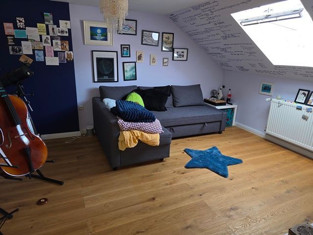 Im DG erreichen Sie über einen großzügigen und wohnlichen Flur, 2 weitere Zimmer mit jeweils ca.12m² Wohnfläche. Diese neue Raumgestaltung aus 2013 erhielt ebenfalls eine neue Elektrik, Heizung, Dachdämmung, erneuerte Sparren und 1 Fenster. 2021 kamen 3 Fenster neu, Parkett und Bodendämmung.