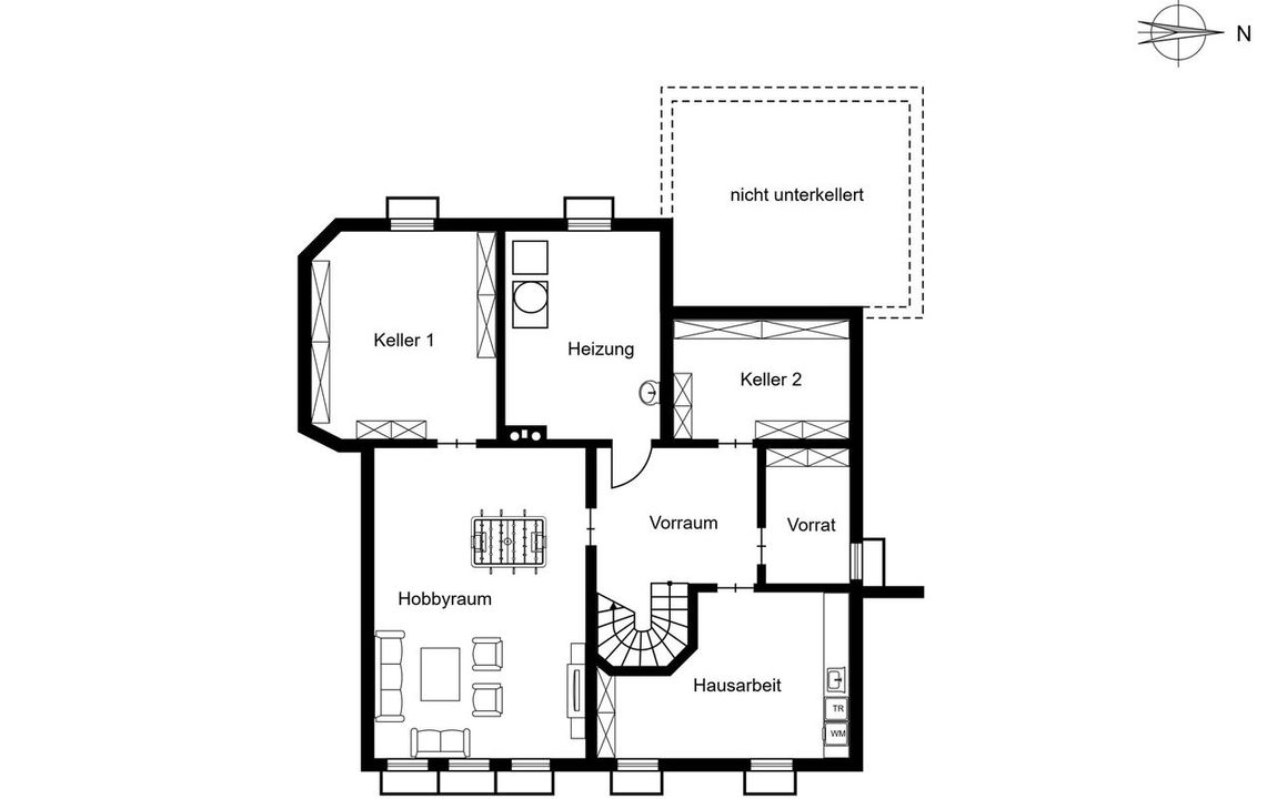 Der vollunterkellerte Bereich umfasst sechs Räume, inklusive eines Hobbyraums, Vorratsraums und weiterer flexibel nutzbarer Flächen. Die Zentralheizung aus dem Jahr 2008 arbeitet mit Gas als Energieträger.