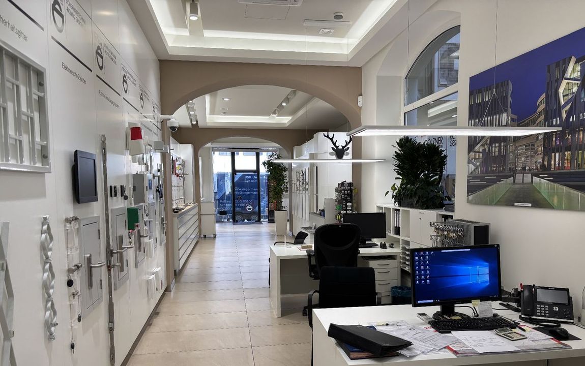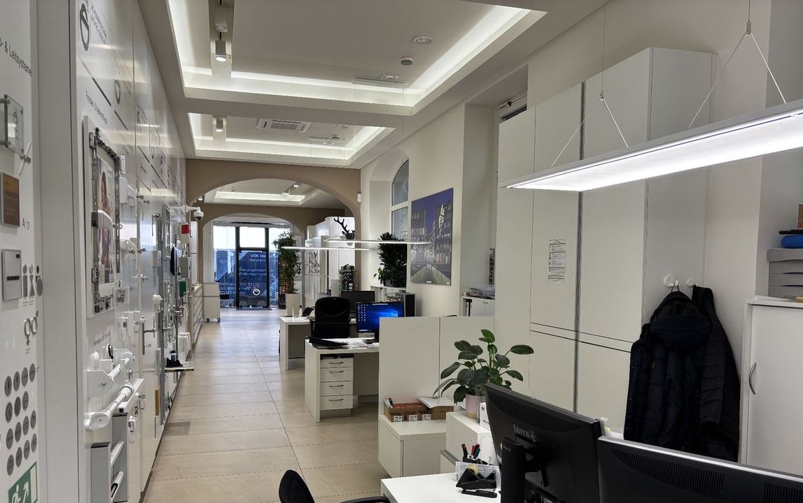 Das Ladenlokal befindet sich in einem innen wie außen sehr gepflegten Wohn- und Geschäftshaus. Mit hohen Decken und Schaufenstern zur Straße ist das Ladenlokal ein Blickfang. Es verfügt über einen großzügigen, lang gestreckten Verkaufsraum (ca. 88 m²) sowie einen Büroraum und eine WC-Einheit, beides im hinteren Bereich des Ladenlokals.