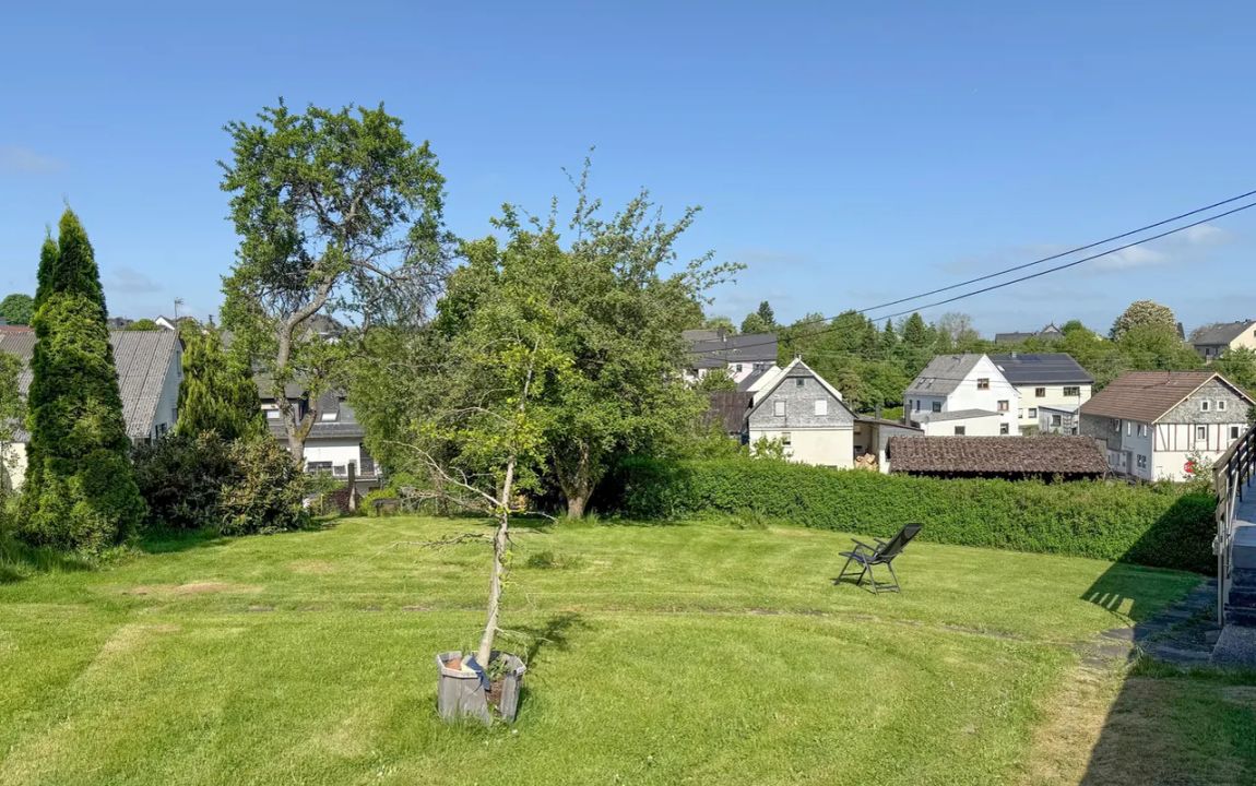 Vom Grundstück hinter dem Haus kann man einen herrlichen Blick über die Ortschaft und ins Grüne genießen. Hier befinden sich auch vereinzelte Bäume und Sträucher. Hinter dem Hausgrundstück bieten Wiesen und Felder einen unmittelbaren Zugang zur angrenzenden Natur.