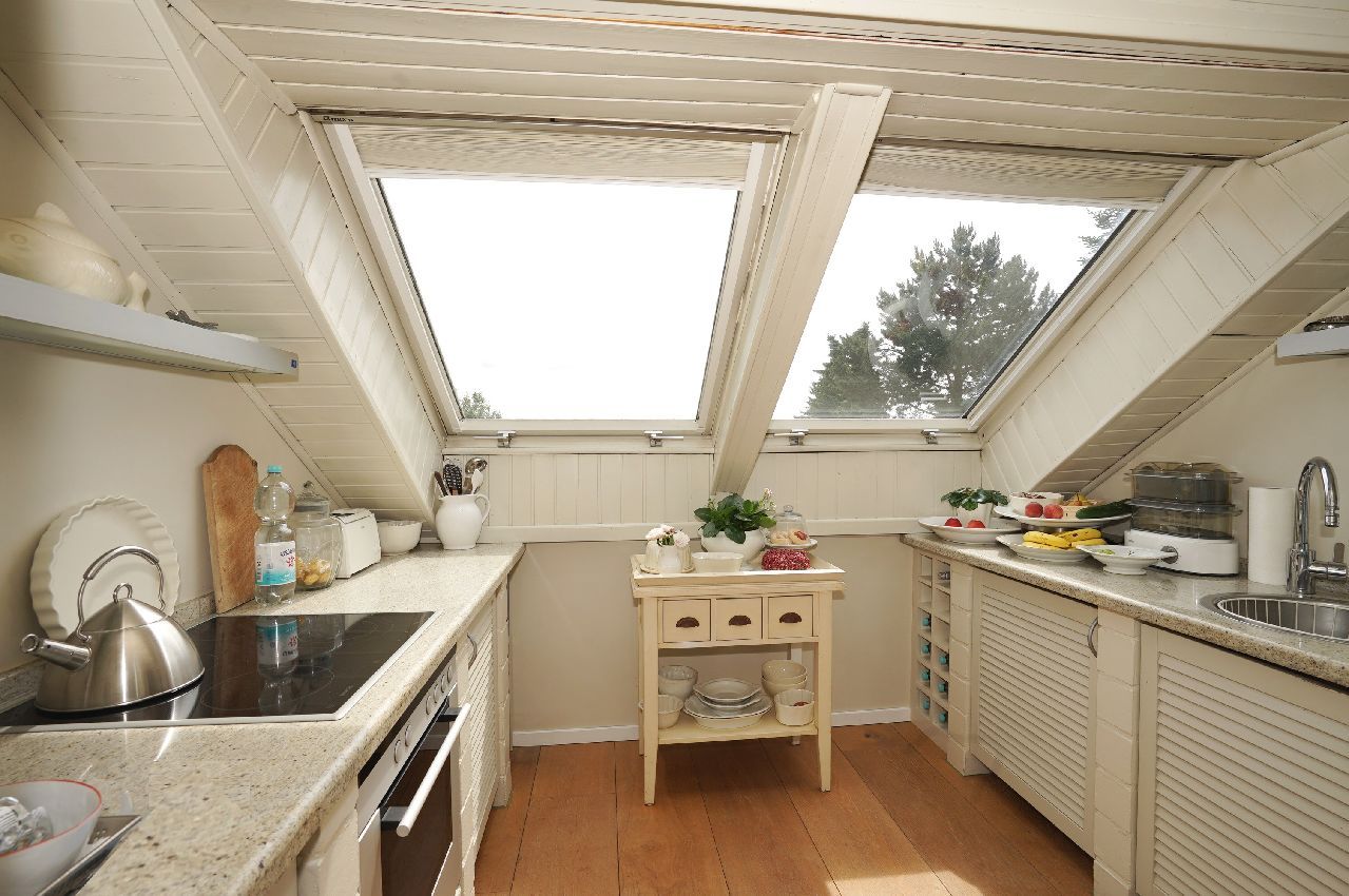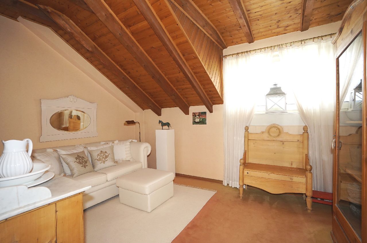 Die wohnlich ausgebaute und integrierte Galerie (Speicher) wird durch den großen Deckenausschnitt voll in das Raumkonzept integriert und ist über die breite Vollholztreppe leicht erreichbar. Sie bietet als multifunktionale Ebene bedarfsgerechten Nutzungen Raum. Aktuell sind hier ein Arbeits- sowie ein TV-Bereich untergebracht, die durch ein Duschbad ergänzt werden. In den Abseiten des Daches wurden praktische Abstellbereiche vorgesehen. Neben der Belichtung durch die Schiebetüranlage bieten zwei Fenster auf der Galerie sehr gute Belichtungs- und Belüftungsmöglichkeiten. Auch im Duschbad ist ein Dachflächenfenster vorhanden.