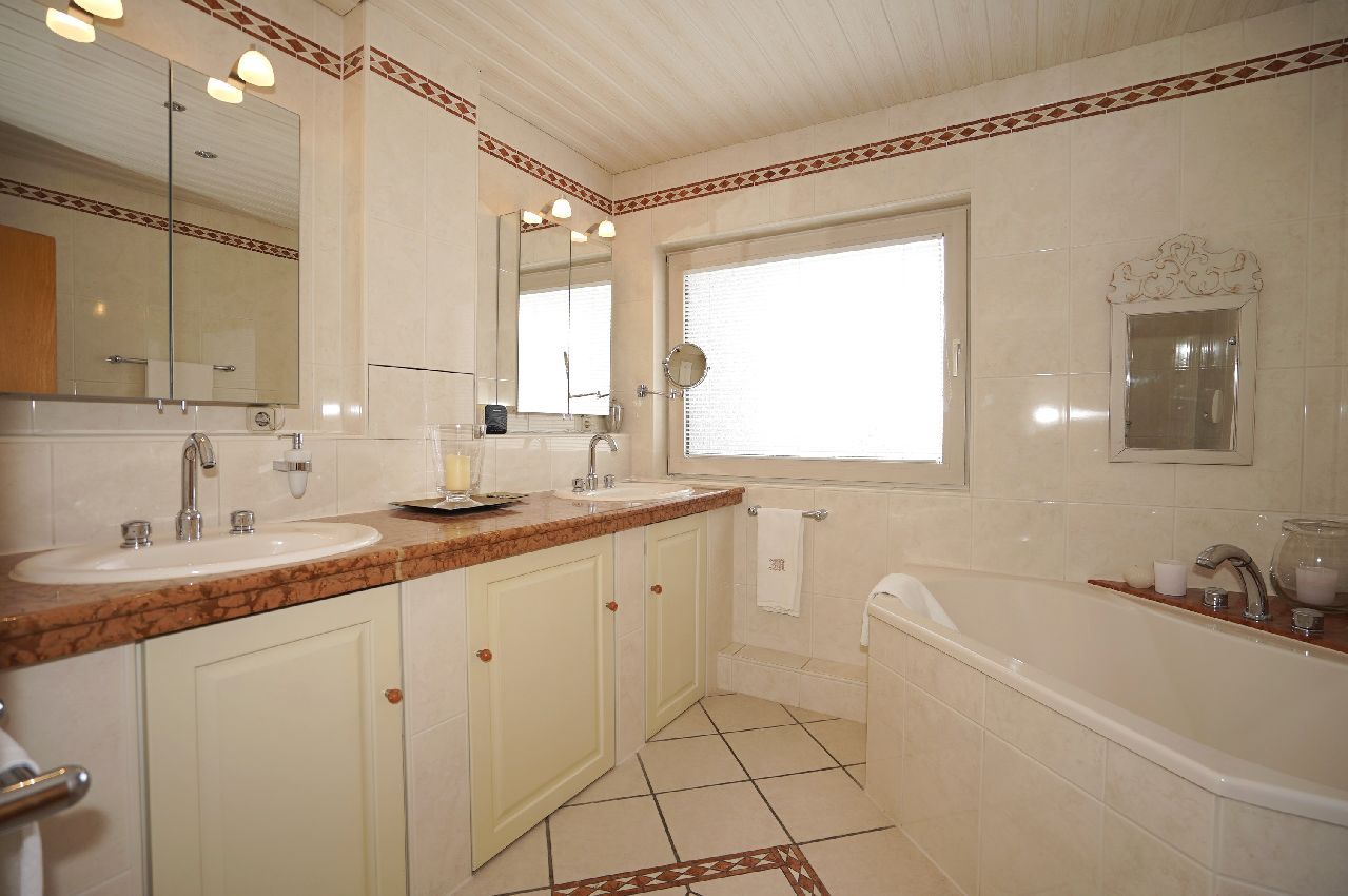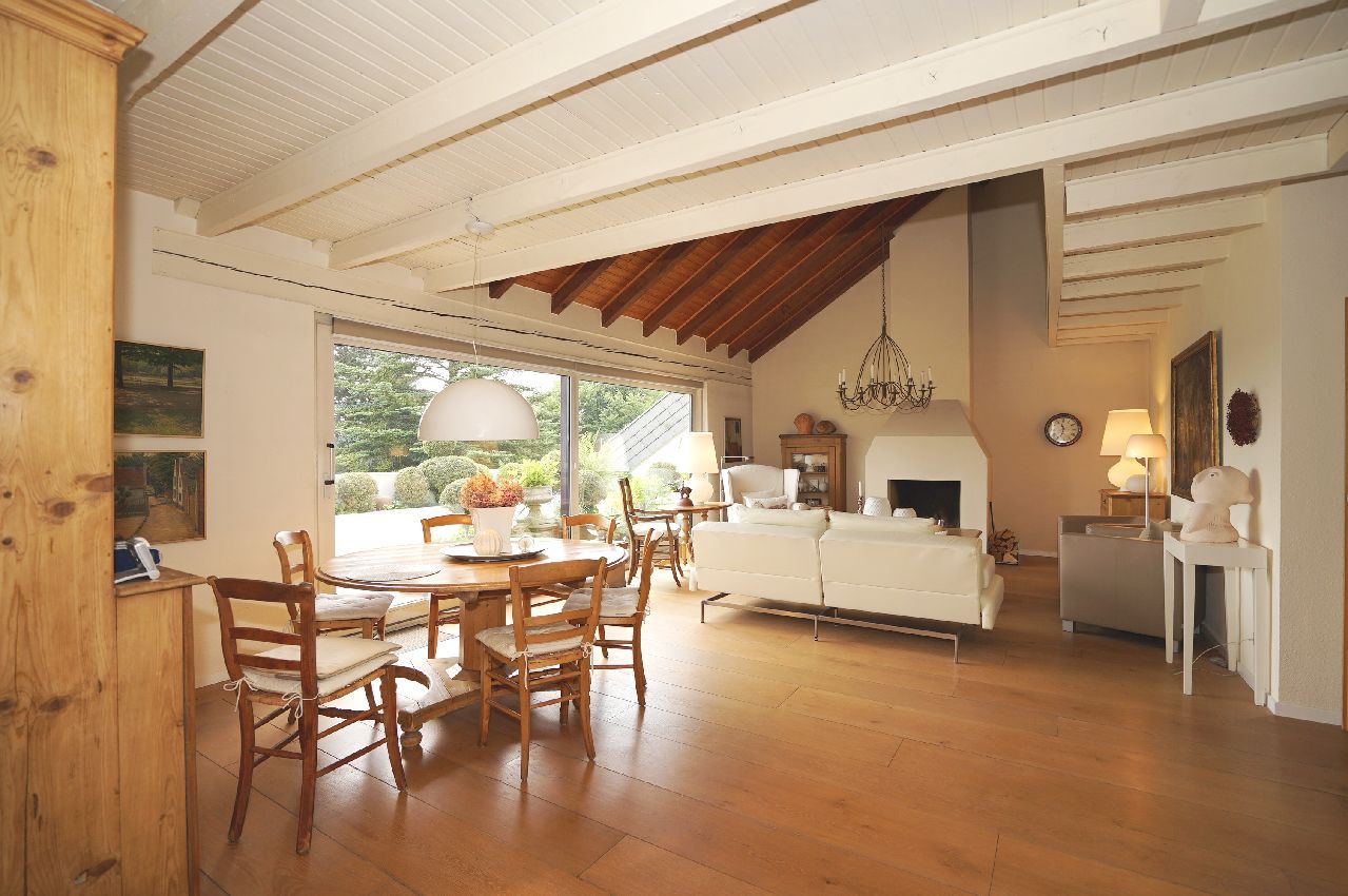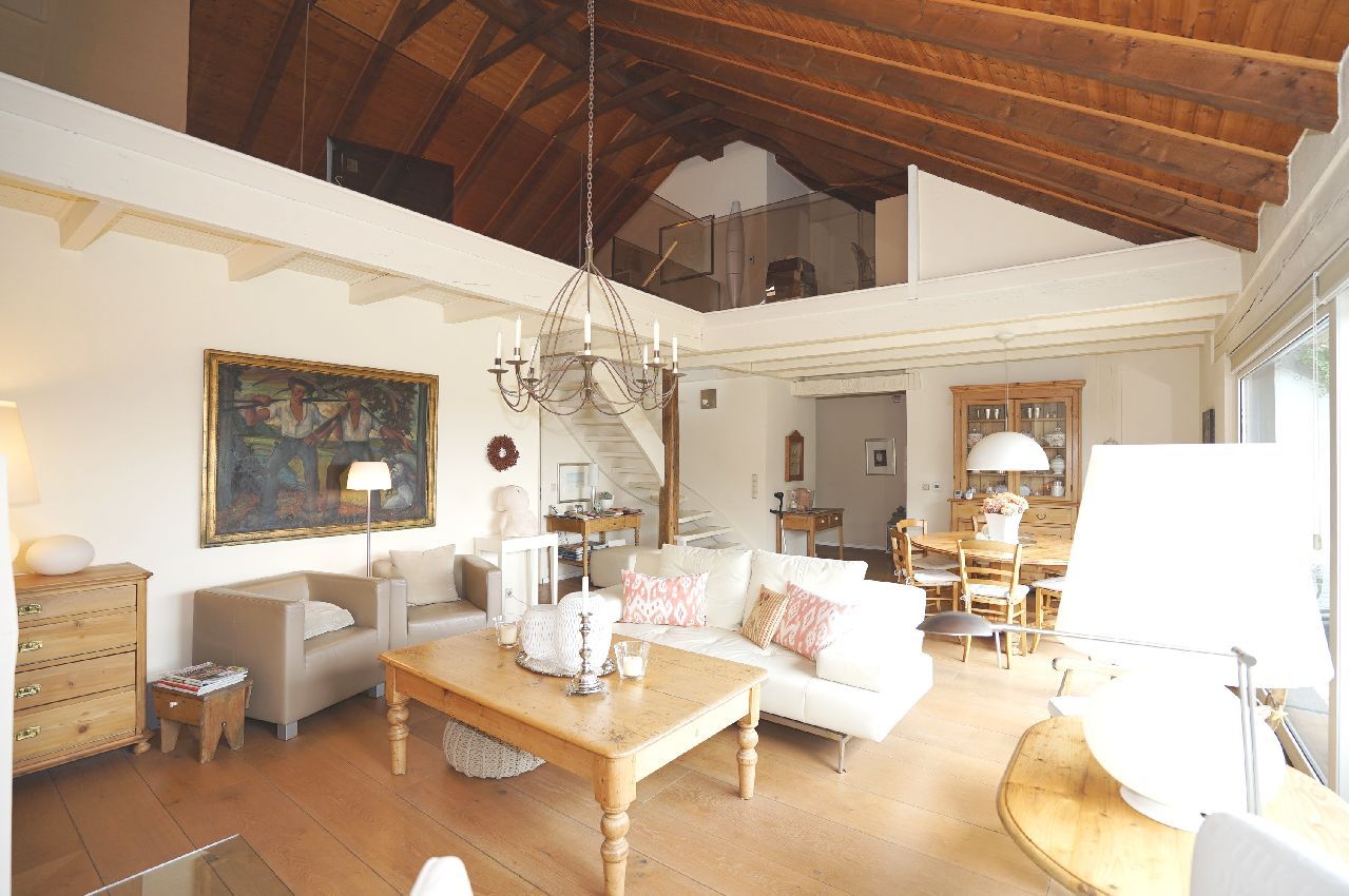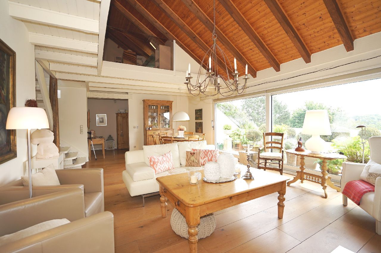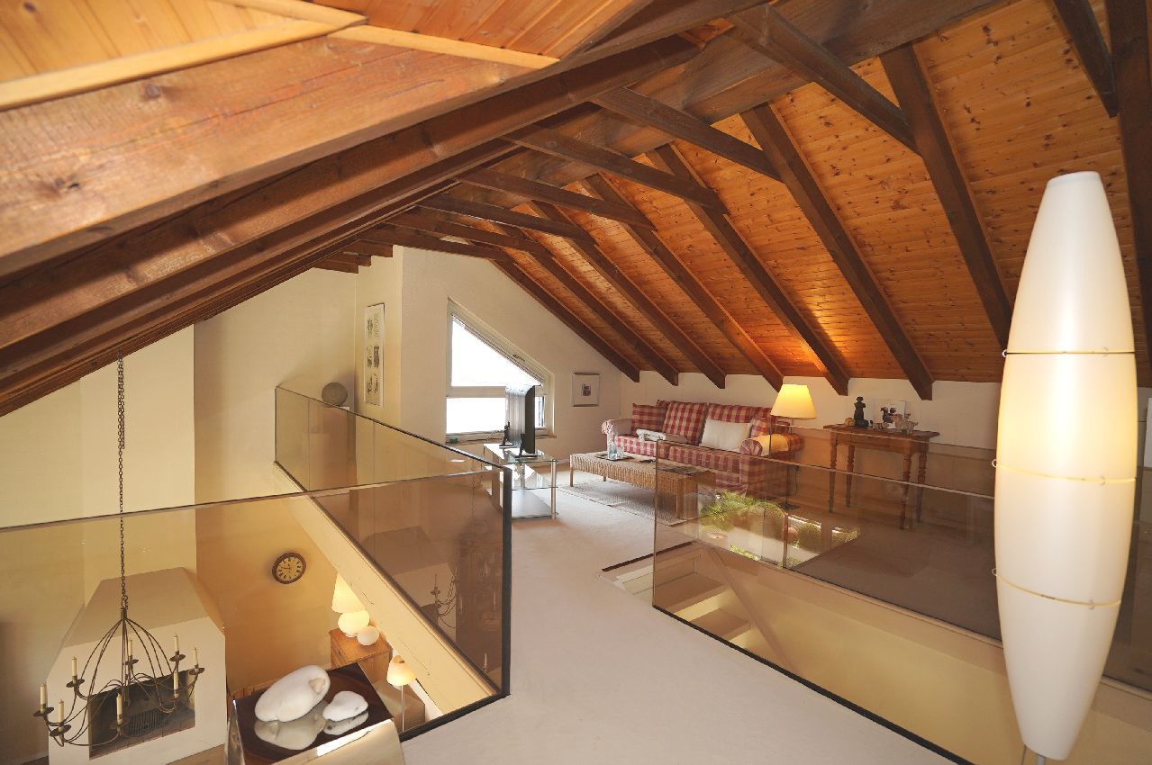Schon im Eingangsbereich der ca. 103 m² großen Wohnebene erkennt man die besondere Gestaltung und Ausstattung der Einheit, die eine angenehme und edle Gemütlichkeit ausstrahlt. Die Küche befindet sich direkt dem Eingang gegenüberliegend, und zur Rechten öffnet sich der Grundriss in den geräumigen Wohn- und Essbereich mit dem auf der Giebelseite zentral gelegenen offenen Kamin. Die Wohnung ist mit dem Wohnzimmer, der Küche und dem Balkon zur Gartenseite ausgerichtet, die den herrlichen Blick in die Natur zulässt. Die Großzügigkeit wird durch den großen Luftraum oberhalb des Wohnzimmers noch verstärkt, und mündet in einer ca. 27 m² großen, offen und wohnlich ausgebauten Galerie mit Fernsehbereich, Arbeitsplatz und Gäste-Duschbad. Die Kombination aus massivem Dielenboden und Glasflächen ergänzt sich hervorragend.