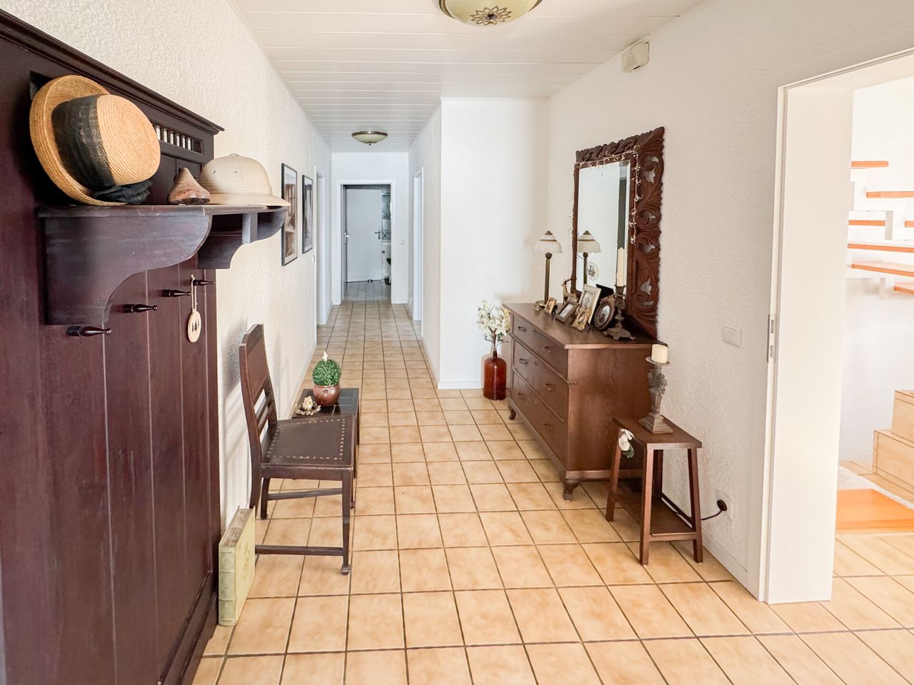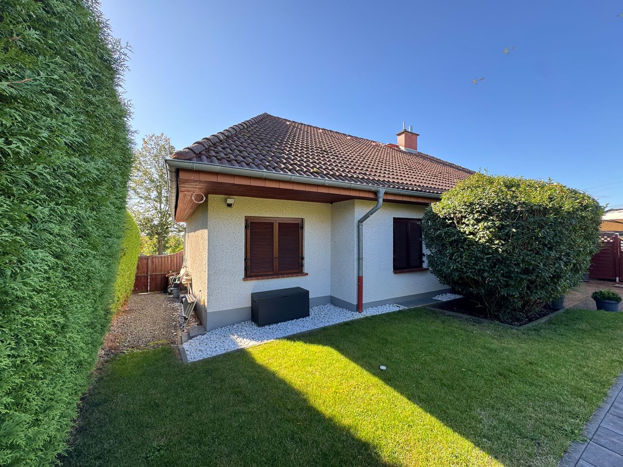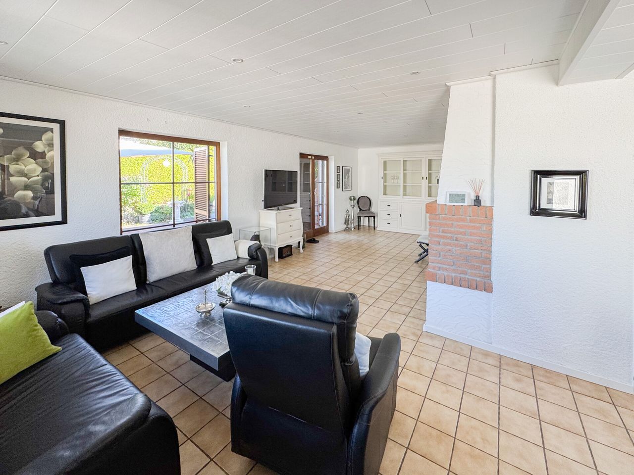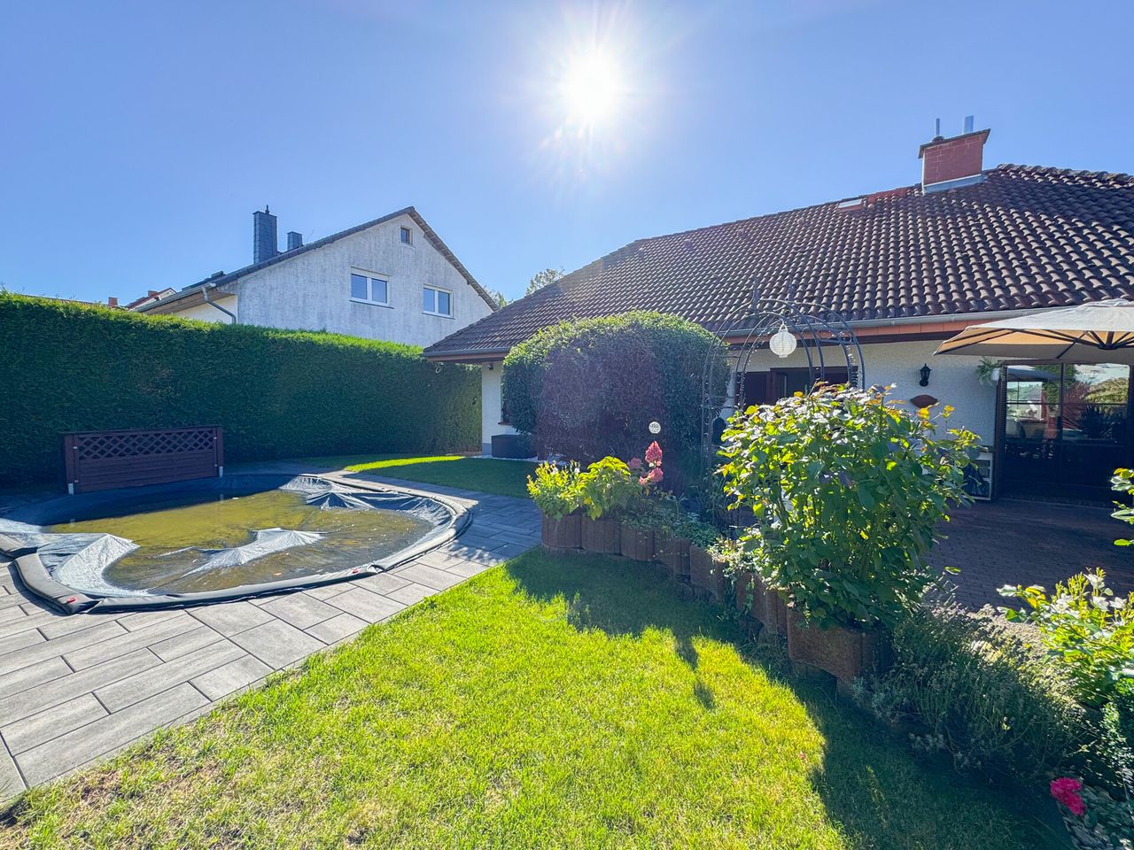 Dieses massive Einfamilienhaus wurde ca. 1990 erbaut und erstreckt sich über eine Etage, wodurch Wohnen auf einer Ebene ermöglicht wird. Die Wohnfläche von ca. 142 m² umfasst ein klimatisiertes Schlafzimmer mit angrenzender Ankleide, ein Büro/Kind, ein Badezimmer sowie Gäste. Der begehbare Kleiderschrank sorgt für Stauraum und Komfort. Die Einbauküche lädt zum Kochen und Verweilen ein. Ergänzend sorgt ein luxuriöser Wellnessbereich mit Sauna und Pool für Entspannung. Im EG befinden sich zudem der Wohnbereich und das Esszimmer mit Zugang zum Garten, sodass Sie nahtlos Innen- und Außenwohnen genießen. Das ca. 592 m² große Grundstück bietet eine tolle Fernsicht. Der gepflegte Garten mit Pool eignet sich hervorragend für gesellige Abende oder ruhige Momente im Freien. Das Haus ist unterkellert und bietet vielseitige Nutzungsmöglichkeiten-neben dem Hobbyraum mit Sauna und Duschbad mit WC stehen zusätzliche Stauraumflächen und Weiteres zur individuellen Nutzung bereit. Das DG bietet zudem Ausbaupotenzial: Raumhöhe und Raumgestaltungsmöglichkeiten ermöglichen eine flexible Erweiterung bei Bedarf, z. B. als zusätzlicher Wohn- oder Arbeitsbereich, Gästezimmer oder Mansardenzugang. Der Hofbereich mit großer Garage sorgt für ausreichend Stellfläche für Ihre PKWs.
