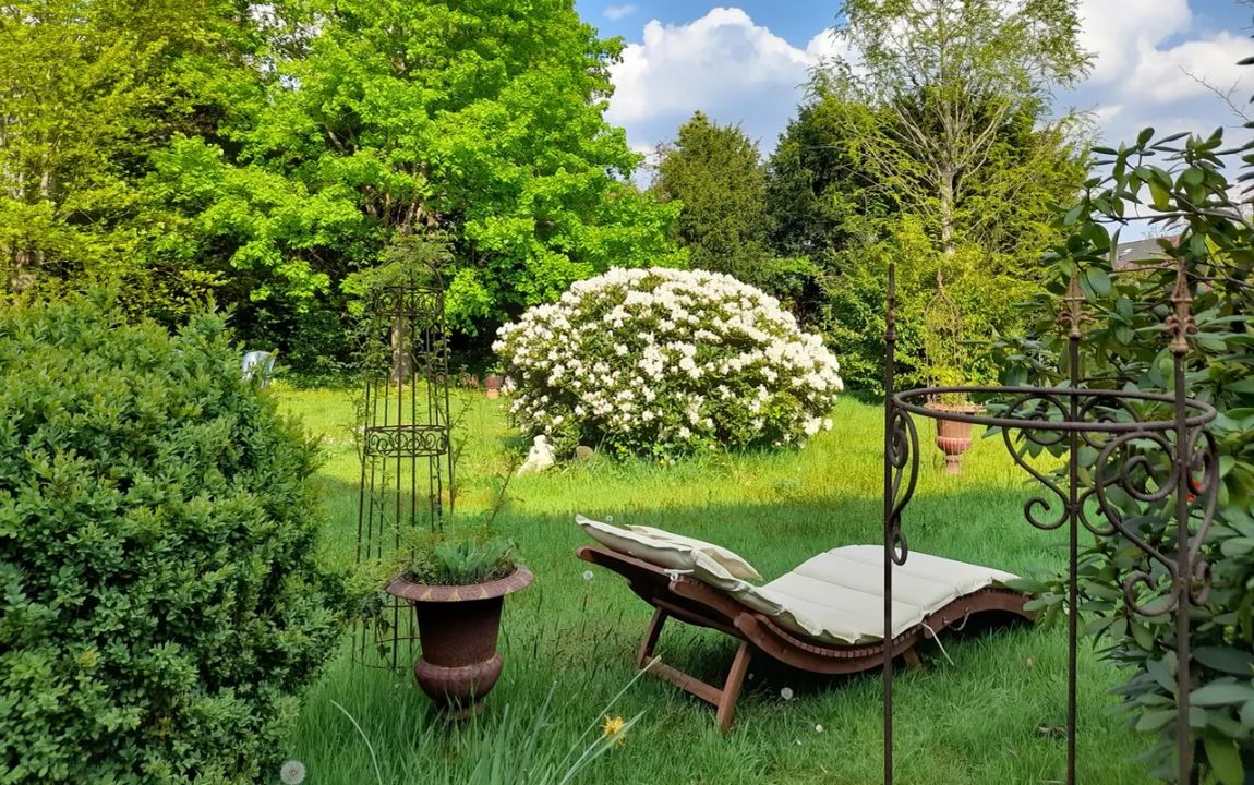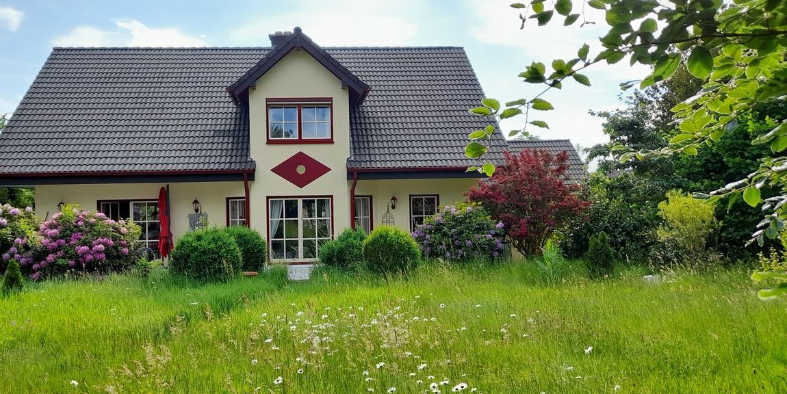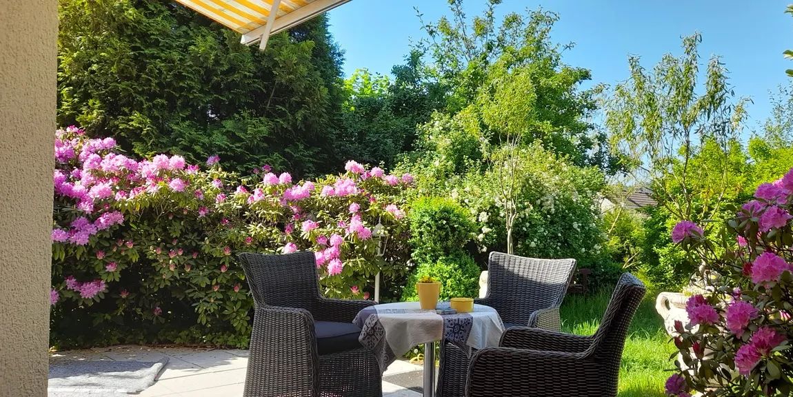 Im Außenbereich lädt der liebevoll angelegte Naturgarten mit seiner Pflanzenvielfalt zum Verweilen ein. Die große Terrasse bietet reichlich Platz für gemeinsame Stunden mit Familie und Freunden und ist gleichzeitig ein ruhiger Rückzugsort im Grünen.