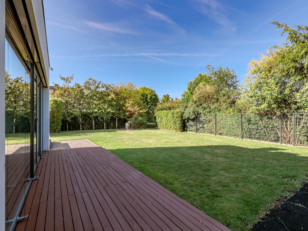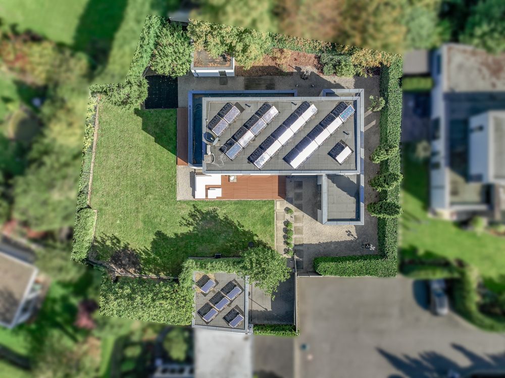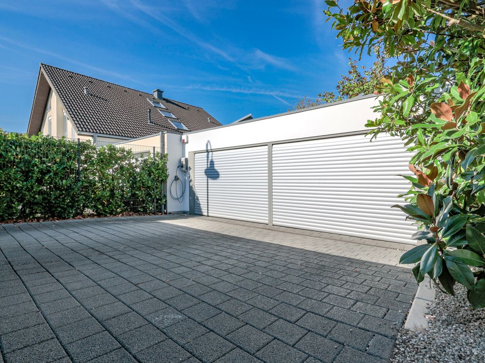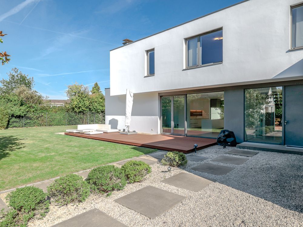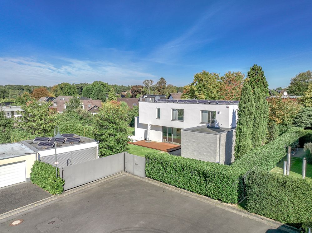 Der Außenbereich bietet mit drei Terrassen viel Platz zum Entspannen. Der weitläufige Garten ist mit einem Mähroboter ausgestattet, pflegeleicht angelegt und fügt sich harmonisch in das moderne Gesamtbild der Immobilie ein. Eine geräumige Garage mit Platz für zwei bis drei Fahrzeuge sowie zwei Außenstellplätze ergänzen das Angebot. Für Elektromobilität steht zudem eine E-Ladesäule zur Verfügung.