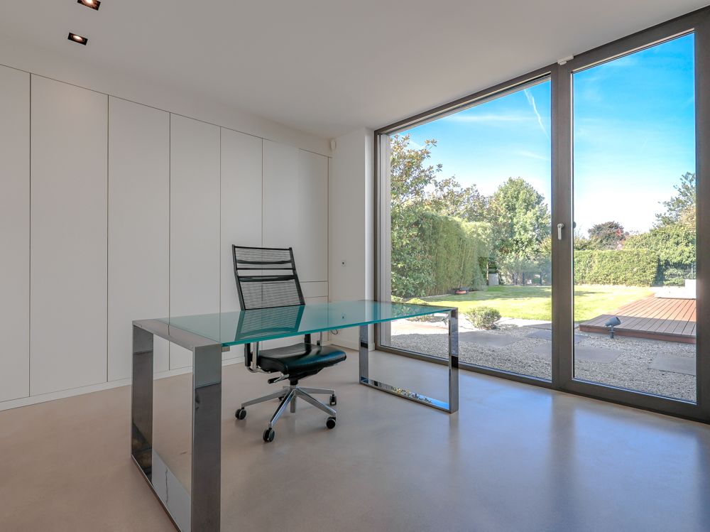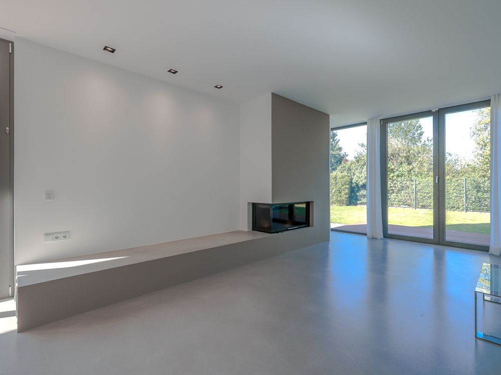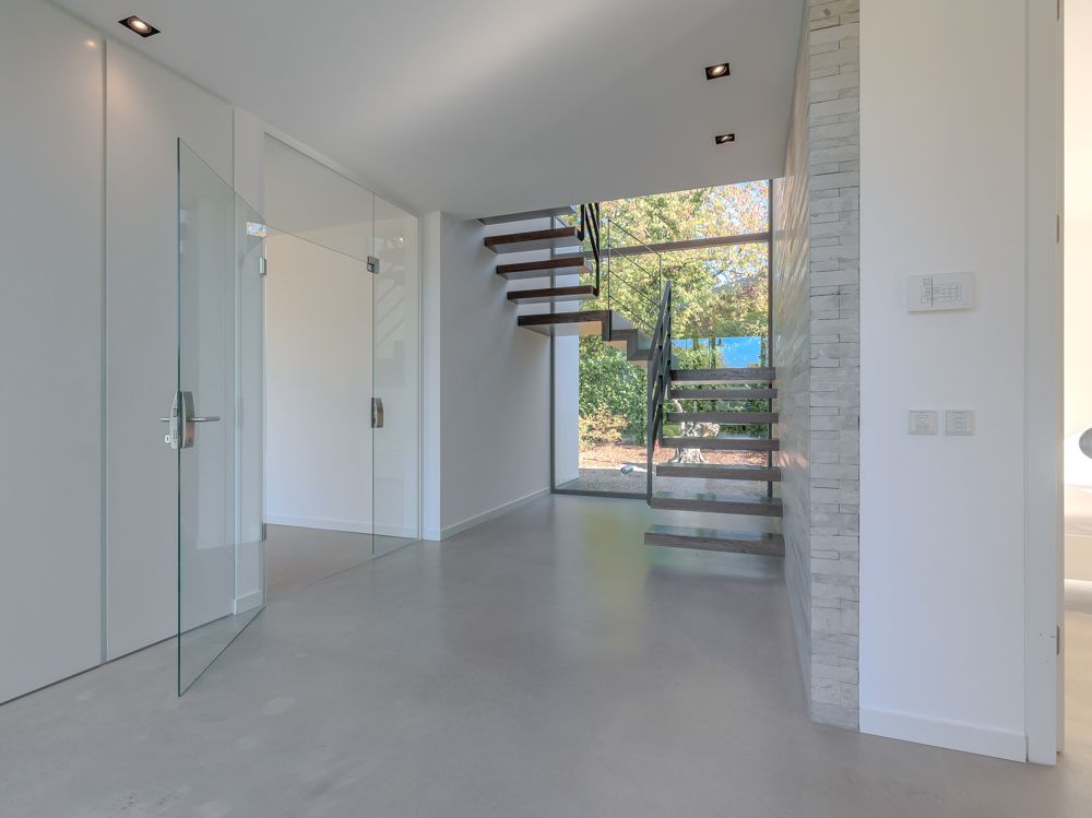 Das Haus erstreckt sich über Erd- und Obergeschoss und beeindruckt bereits beim Betreten mit seiner offenen, lichtdurchfluteten Gestaltung. Großzügige Glasflächen schaffen fließende Übergänge zwischen Innen- und Außenbereich, während hochwertige Materialien und ein fugenloser Boden ein modernes, harmonisches Gesamtbild erzeugen. Im Wohn- und Essbereich sorgt ein Kamin für behagliche Atmosphäre, während die offen gestaltete Küche mit Kochinsel, hochwertigen Einbauten und einem angrenzenden Vorratsraum überzeugt.