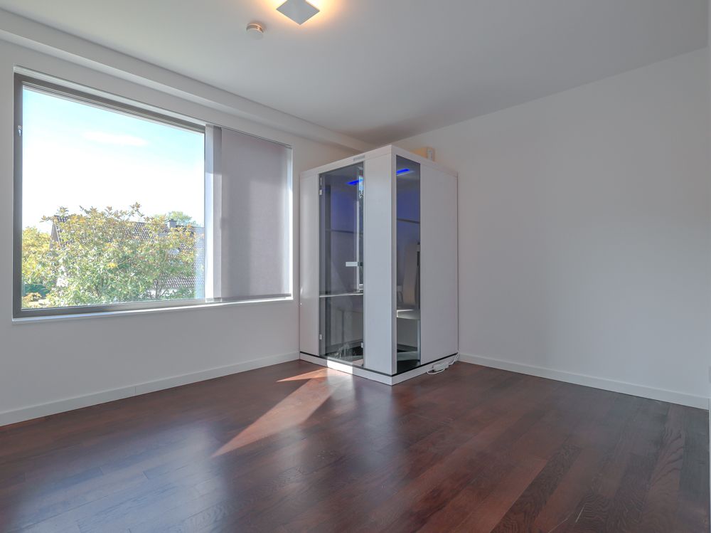 Die Ausstattungsqualität ist durchweg gehoben: raumhohe Innentüren, passgenaue Einbauschränke in nahezu allen Räumen, eine effiziente Wärmepumpe und eine Photovoltaikanlage mit 22 Paneelen unterstreichen den modernen Charakter. Darüber hinaus verfügt das Haus über drei stilvolle Badezimmer, ein Zimmer mit integrierter Infrarot-Sauna sowie einen an den Garten angrenzenden Raum, welcher mit Fenstern ausgestattet und beheizt ist.