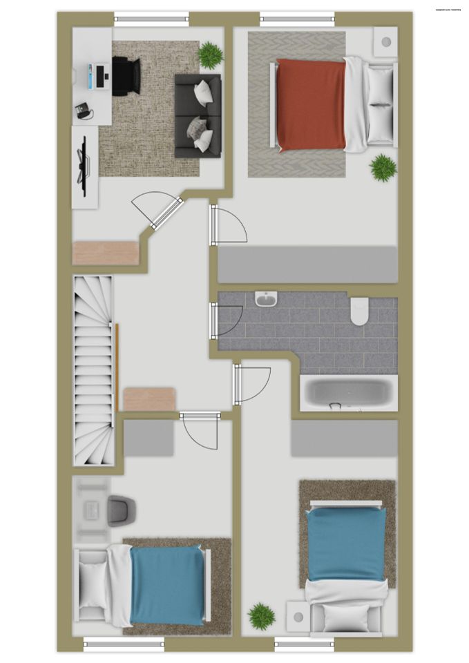 Das Obergeschoss bietet Privatsphäre für jedes Familienmitglied. Vier Zimmer lassen sich ganz nach Bedarf gestalten – als Schlafzimmer, Kinderzimmer, Gäste- oder Arbeitsräume. Ein freundliches Badezimmer mit Badewanne verbindet Funktionalität und Komfort.
