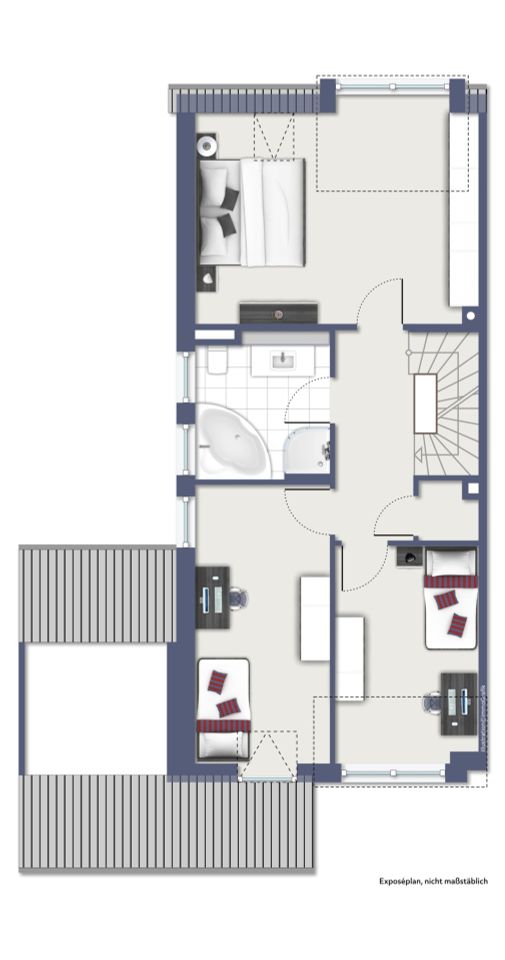 Das Studio im Dachgeschoss bietet vielfältige Nutzungsmöglichkeiten – ob als Elternsuite, Büro oder Gästezimmer – und verfügt über ein weiteres Bad.