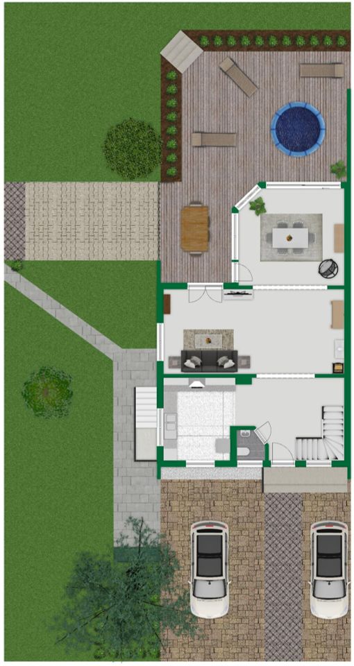 Die Raumaufteilung ist funktional und familiengerecht gestaltet. Im Erdgeschoss befinden sich das helle Wohnzimmer, die moderne Küche sowie der großzügige Wintergarten mit Zugang zur Terrasse. Ein Gäste-WC rundet den Grundriss auf dieser Etage ab.