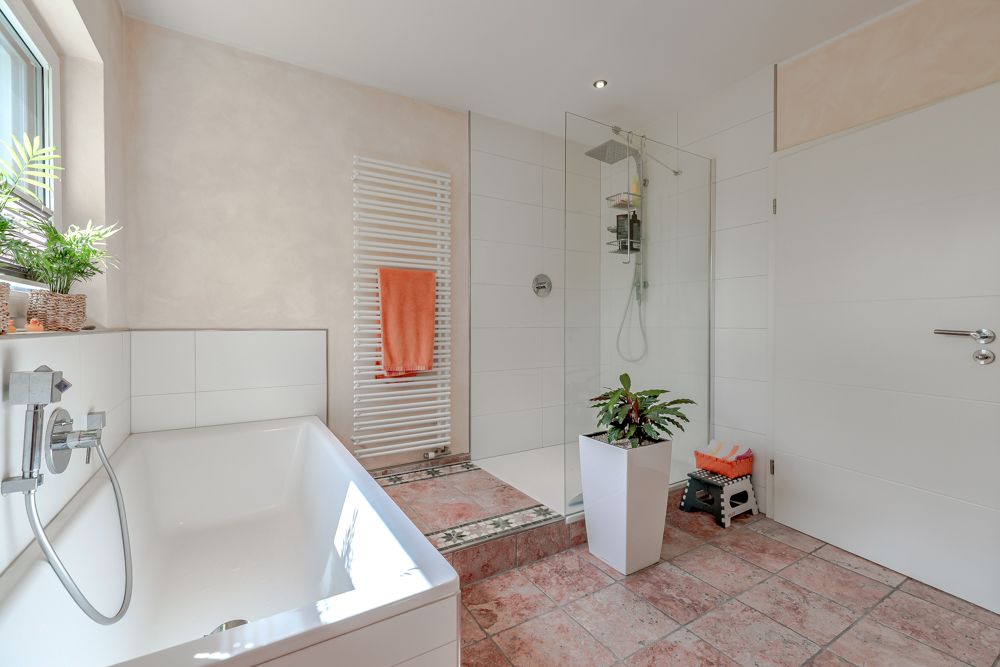 Im Obergeschoss stehen Ihnen zwei Schlafzimmer und ein Balkon mit herrlicher Fernsicht zur Verfügung. Ein stilvolles Badezimmer mit Doppelwaschbecken, Wanne und Dusche mit flachem Einstieg sowie ein separates WC vervollständigen das Raumangebot auf dieser Etage.