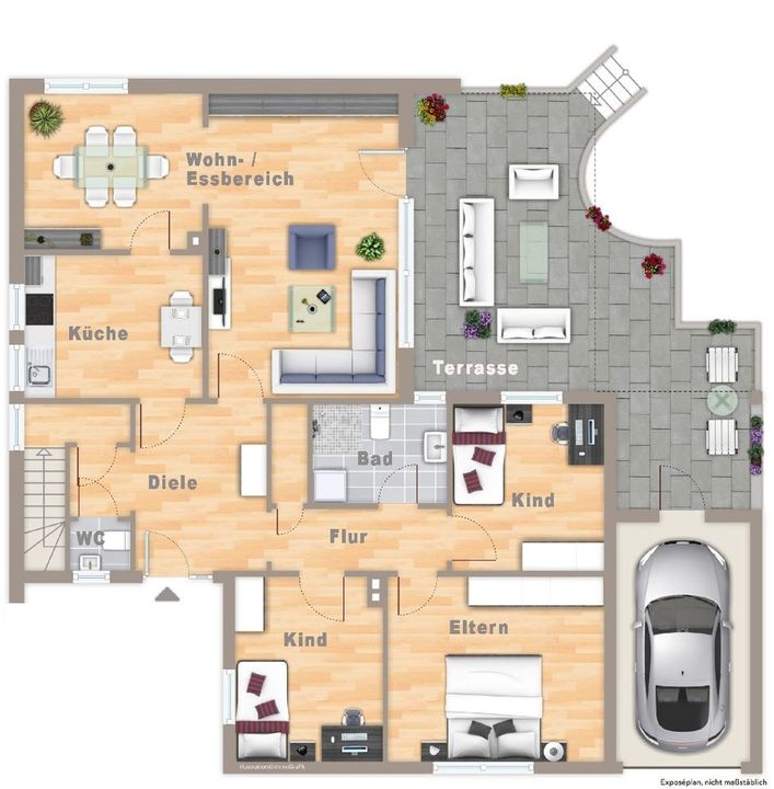 Drei Schlafzimmer mit ca. 10 m², ca. 11 m² und ca. 16 m² sorgen für Rückzugsmöglichkeiten und flexible Nutzung ob für die Familie, Gäste oder als Arbeitszimmer. Eine Küche, ein Esszimmer, ein modernes Duschbad sowie ein separates Gäste-WC runden das Raumangebot auf einer Ebene ab.