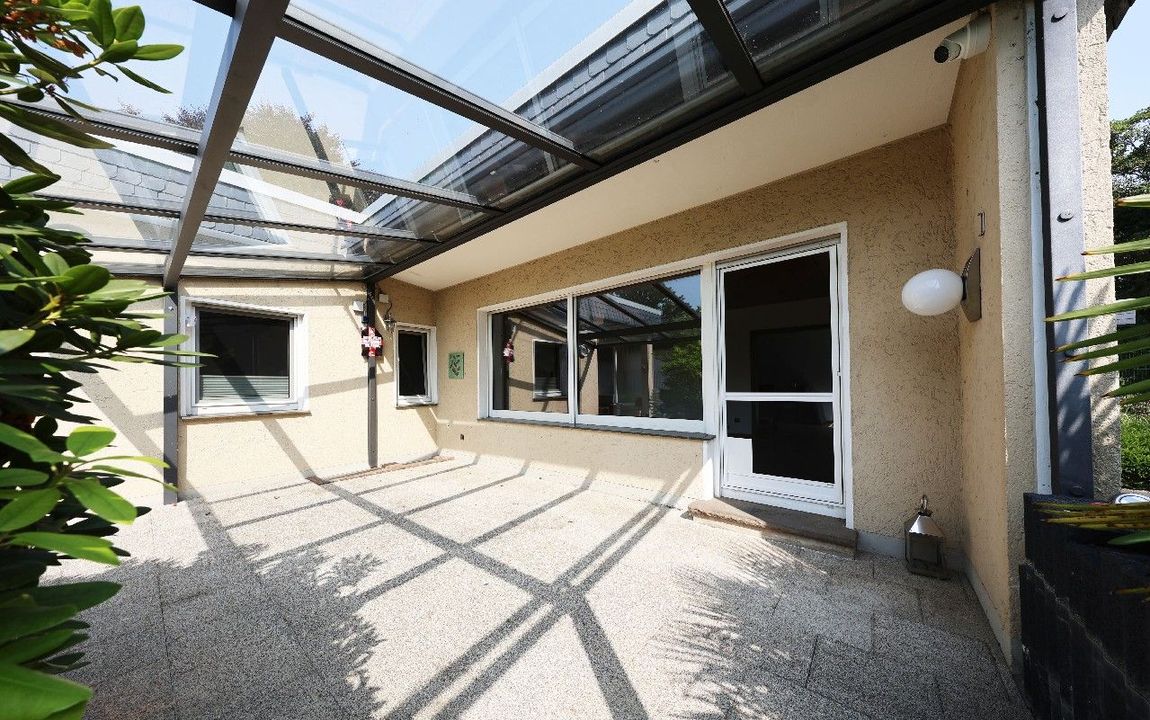 Das Wohnhaus selbst überzeugt durch eine offene und lichtdurchflutete Raumgestaltung. Der Wohn- und Essbereich mit ca. 35 m² schafft eine freundliche Atmosphäre und bietet direkten Zugang zur großen Terrasse. Diese ist mit einer Glasüberdachung und einer Markise ausgestattet, sodass Sie wetterunabhängig den Blick in den Garten genießen können.