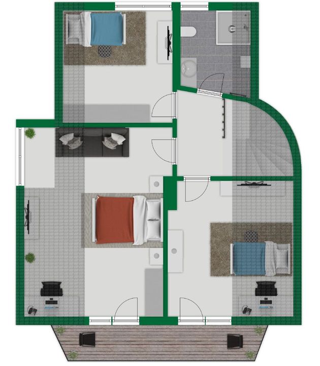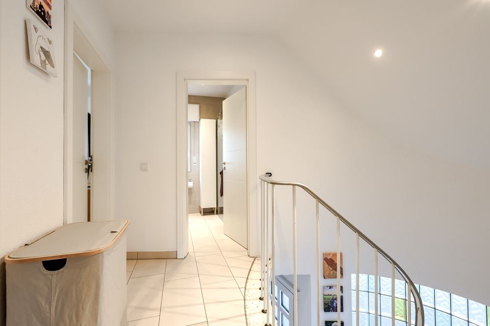 Im Obergeschoss warten gleich drei Schlafzimmer und ein modernes Badezimmer auf Sie. Das Bad ist mit einer ebenerdigen Dusche, WC, Fenster, Waschtisch und Handtuchheizkörper ausgestattet.