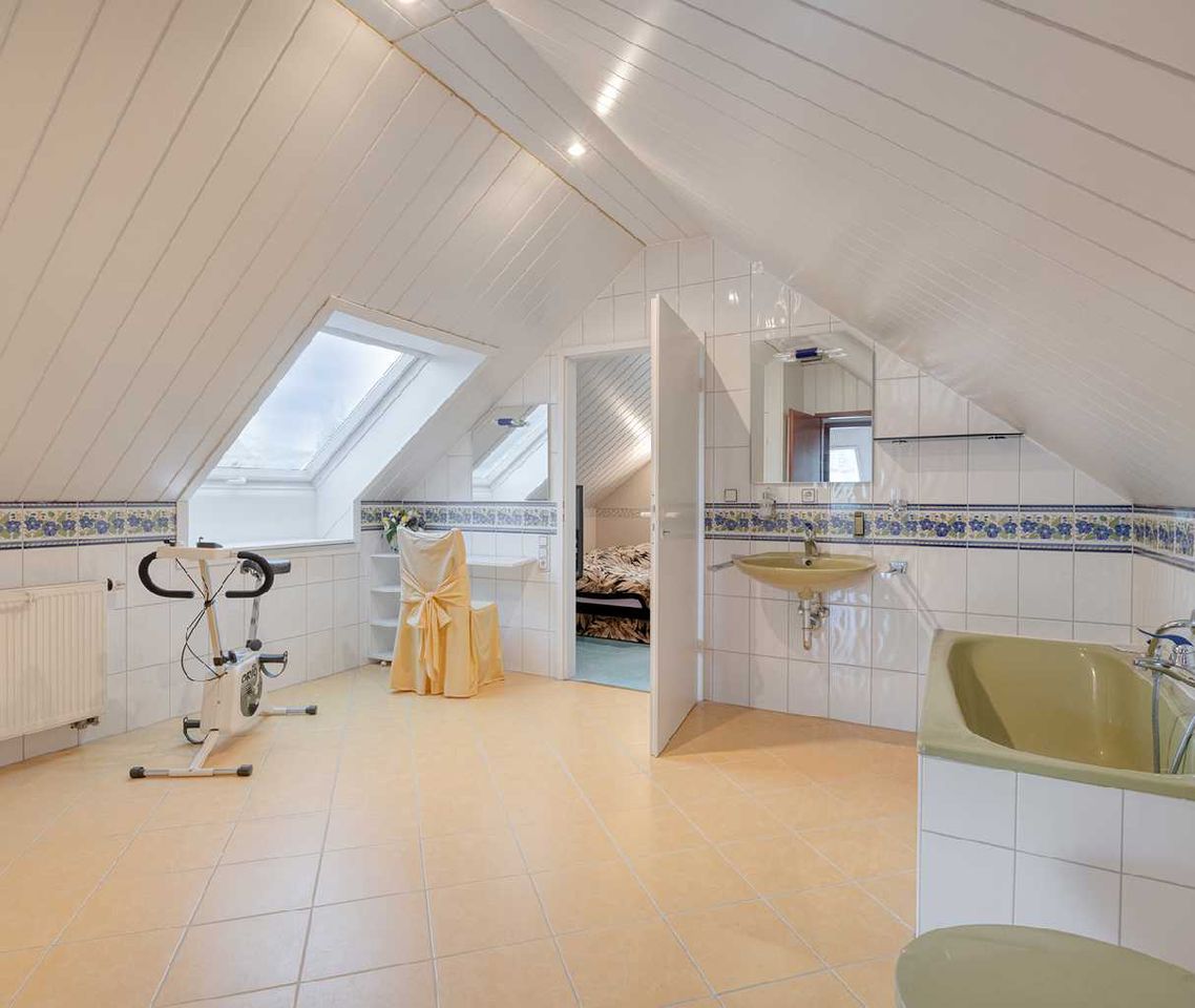 Das Obergeschoss verfügt über ein weiteres Schlafzimmer, ein geräumiges Badezimmer mit Badewanne sowie einen großzügigen Hobbyraum, der flexibel nutzbar ist.