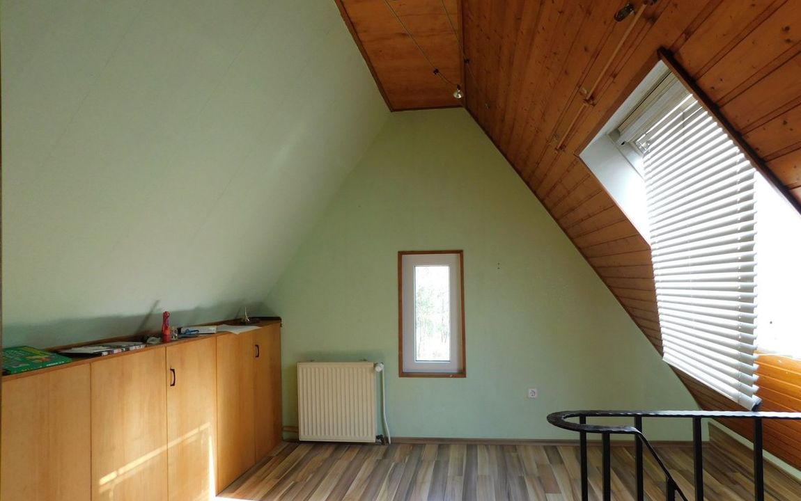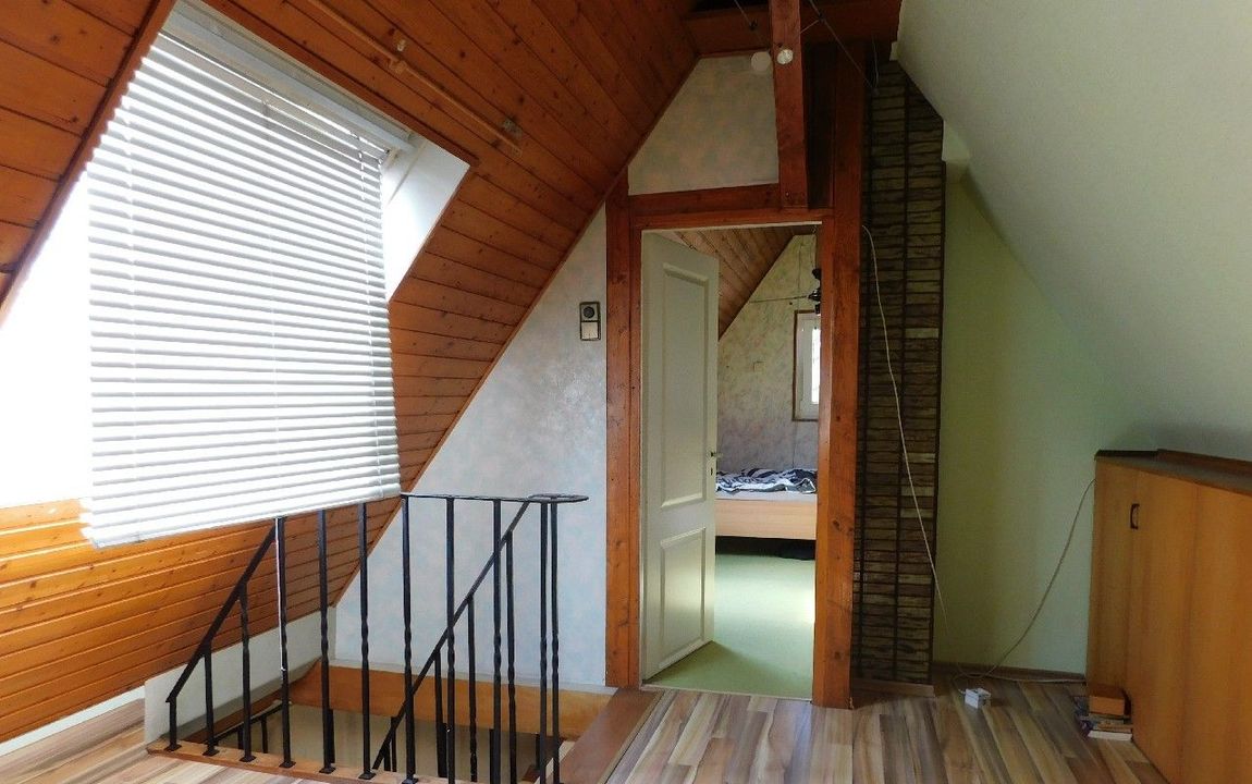 Im Obergeschoss befindet sich das Bad mit einer Badewanne und zwei Waschbecken sowie ein sehr großer Schlaf-/Wohnraum.
