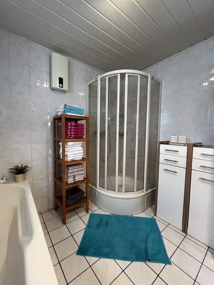 EG: großes Wohnzimmer, zweites Wohnzimmer mit Essbereich, Küche und Durchgang zum Anbau hier befindet sich ein Kinder-/Gästezimmer sowie ein Bad mit separater Toilette.