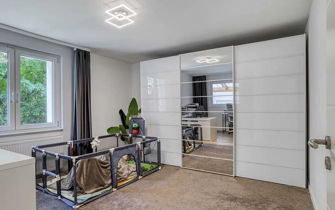 Das Obergeschoss bietet zwei helle Schlafzimmer, einen praktischen Ankleideraum, ein Tageslichtbad sowie einen Abstellraum. Die Etage schafft dank der gut durchdachten Aufteilung Rückzugsorte für jedes Familienmitglied und zugleich viel Raum für persönliche Gestaltung.