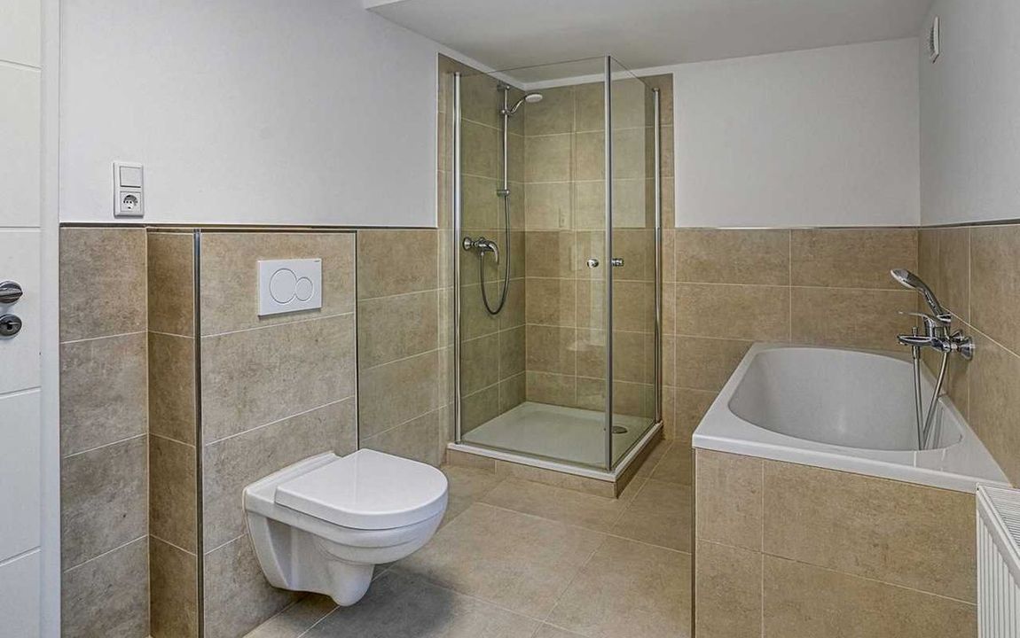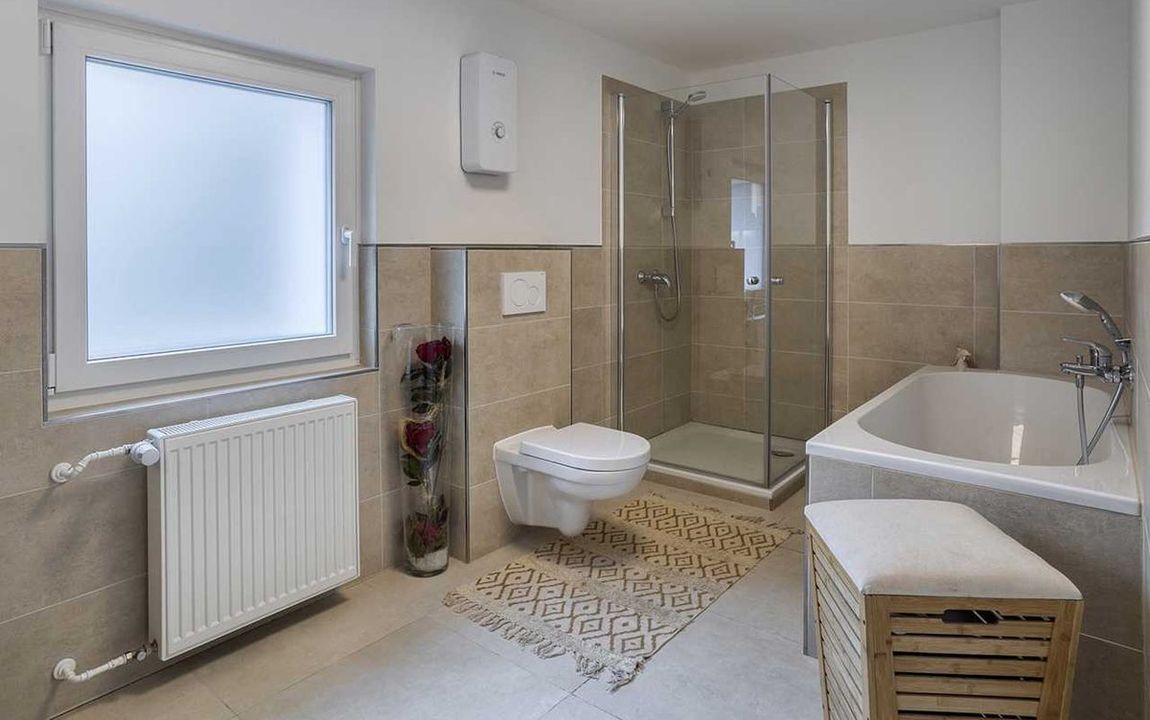 Zwei vollständig ausgestattete Tageslichtbäder mit Badewanne und Dusche (je eines im Erd- und Obergeschoss); zusätzlich Gäste-WC im Erdgeschoss