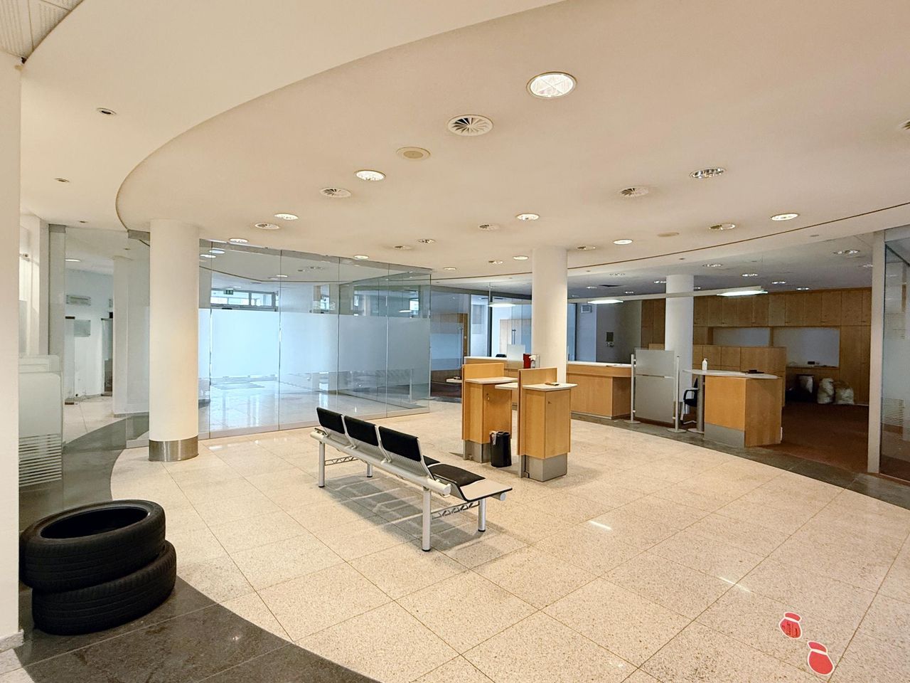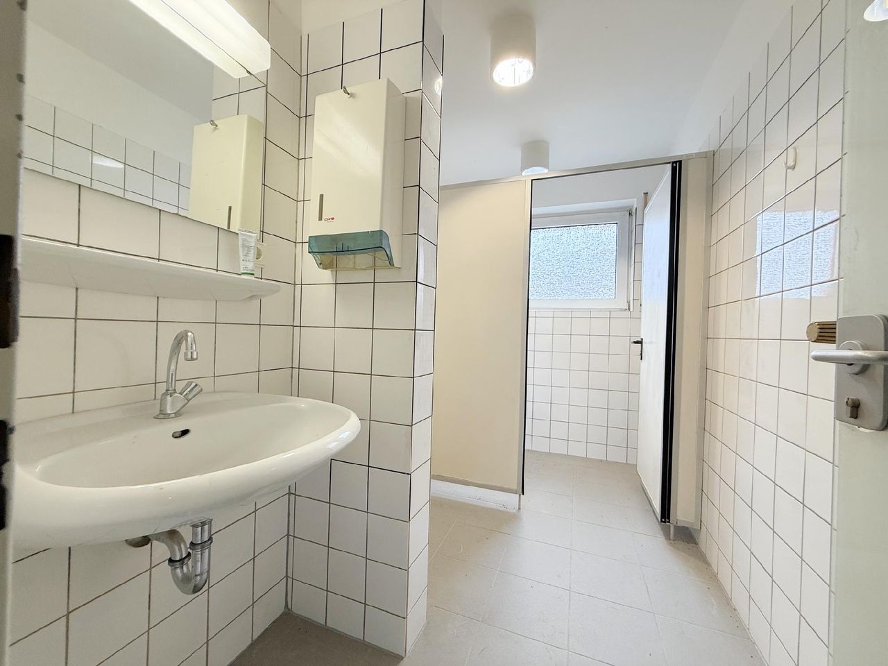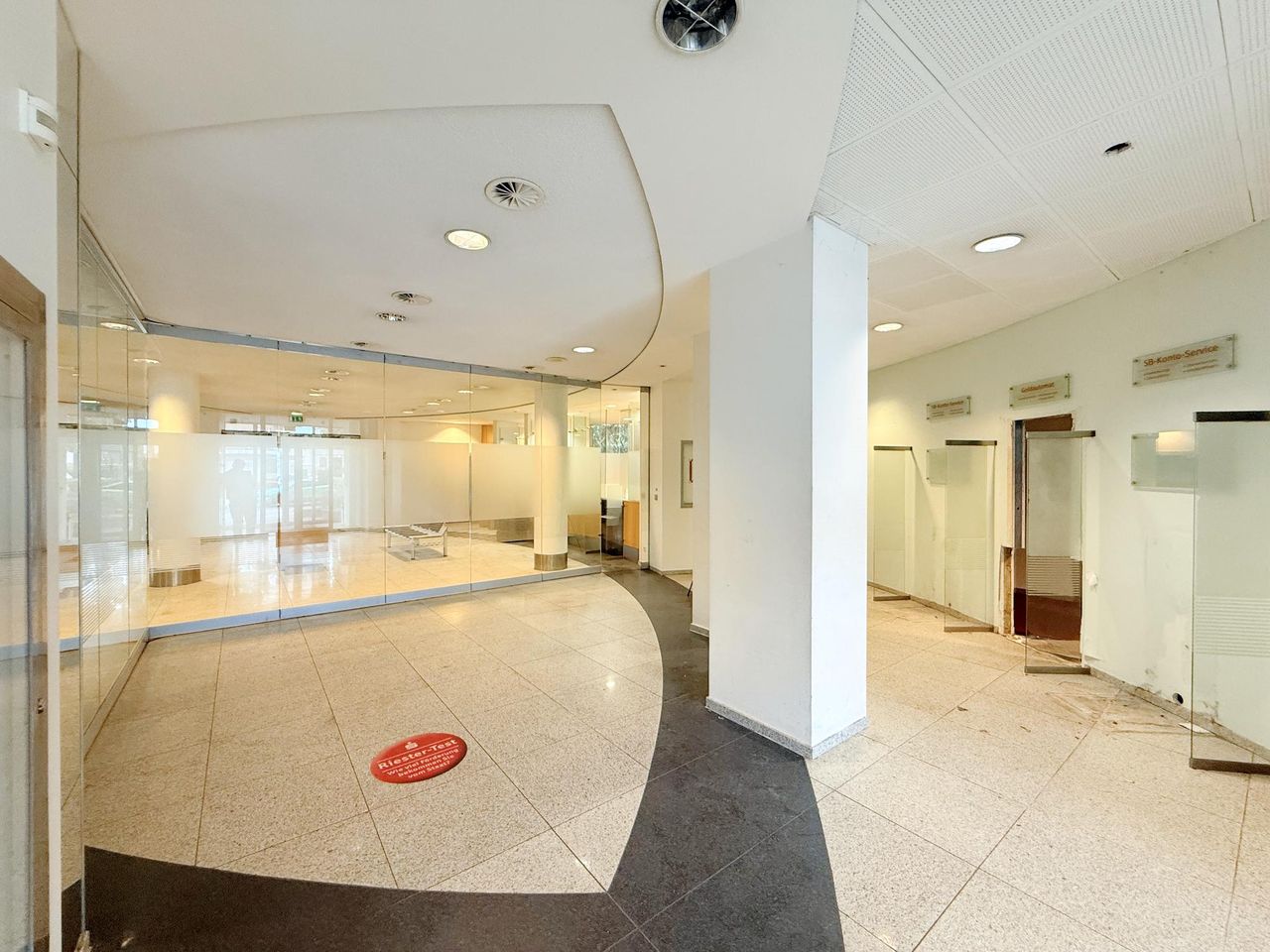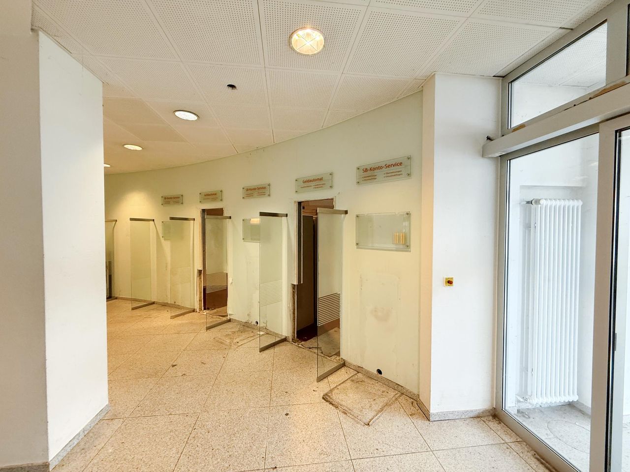 Diese großzügige, ehemals als Bankfiliale genutzte Einheit umfasst rund 440 m² und überzeugt mit einer klaren, kundenorientierten Raumstruktur. Der helle, nahezu ebenerdige Eingangsbereich öffnet sich zu einer weitläufigen Kundenhalle mit markantem Empfangs-/Schalterbereich und mehreren verglasten Beratungsboxen, die Diskretion bieten und zugleich Transparenz schaffen. Robuste Stein- bzw. Feinsteinzeugböden im Publikumsbereich, roter textiler Belag in den Büros sowie abgehängte Lochrasterdecken mit integrierten Einbauleuchten und sichtbaren Auslässen der Raumlufttechnik prägen den professionellen Gesamteindruck. Rückwärtig gliedert sich die Fläche in funktionale Back-Office-Zonen, ruhige Einzel- und Teamräume, Besprechungszimmer sowie Archiv- und Technikflächen; eine interne Treppe bindet zusätzliche Nebenbereiche an und sorgt für kurze Wege im Arbeitsalltag. Die Sanitärbereiche sind hell gefliest, teilweise tagesbelichtet und getrennt angeordnet. Großzügige Fensterfronten bringen viel Tageslicht in die Räume, klassische Heizkörper sorgen für eine zuverlässige Beheizung. Frühere SB-Zonen der Bank etwa Konto-/Servicebereiche sind noch vorhanden und lassen sich je nach Bedarf weiterverwenden oder rückbauen. Insgesamt präsentiert sich das Objekt in solidem, stellenweise modernisierungsbedürftigem Zustand und bietet damit hervorragende Voraussetzungen für eine zügige Inbetriebnahme bei gleichzeitig hoher Gestaltungsfreiheit. Ob Beratung, Kanzlei, Agentur, Praxis/Therapie, Bildung oder Showroom mit Empfang die überwiegend leichten Trennwände und die großzügigen Sichtachsen erlauben flexible Umbauten bis hin zu offenen Teamflächen oder zusätzlichen Meeting- und Schulungsräumen. Eine repräsentative Adresse mit viel Potenzial für moderne Dienstleistungs- und Büronutzungen.