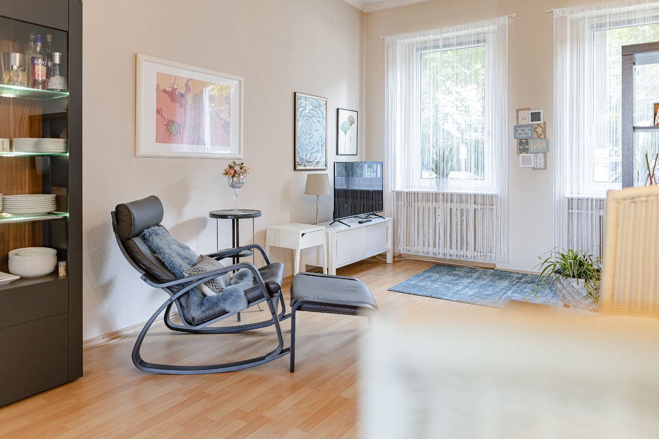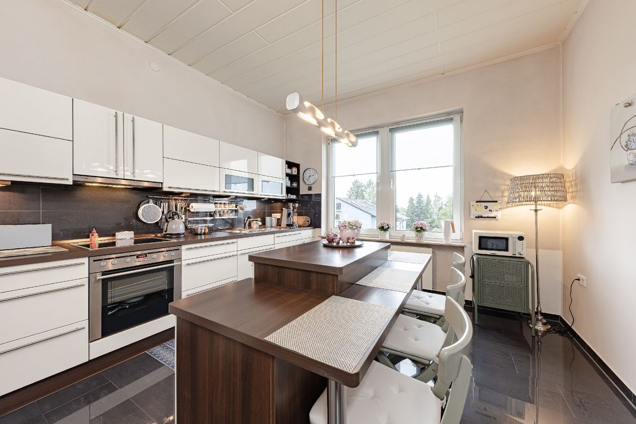 Diese wunderschöne Eigentumswohnung befindet sich in einem stilvollen Reihenensemble aus dem Jahr 1950, bestehend aus vier ruhigen Dreifamilienhäusern. Die kleine, harmonische Eigentümergemeinschaft sorgt für ein angenehmes und gepflegtes Wohnumfeld. Die Wohnung selbst besticht durch ihren Altbaucharakter mit hohen Decken, großzügigen Raumproportionen und einem lichtdurchfluteten Wohn- und Essbereich, der durch eine Schiebetür flexibel trennbar ist. Vom Wohnzimmer mit Balkon eröffnet sich eine beeindruckende Aussicht über Wuppertal, während die stilvolle Wohnküche mit Kücheninsel zusätzlichen Komfort und modernes Ambiente bietet. Im gemeinschaftlich nutzbaren Garten steht der Wohnung ein eigener, liebevoll gestalteter Bereich mit Terrasse zur Verfügung – ein besonderer Rückzugsort zum Entspannen und Genießen.