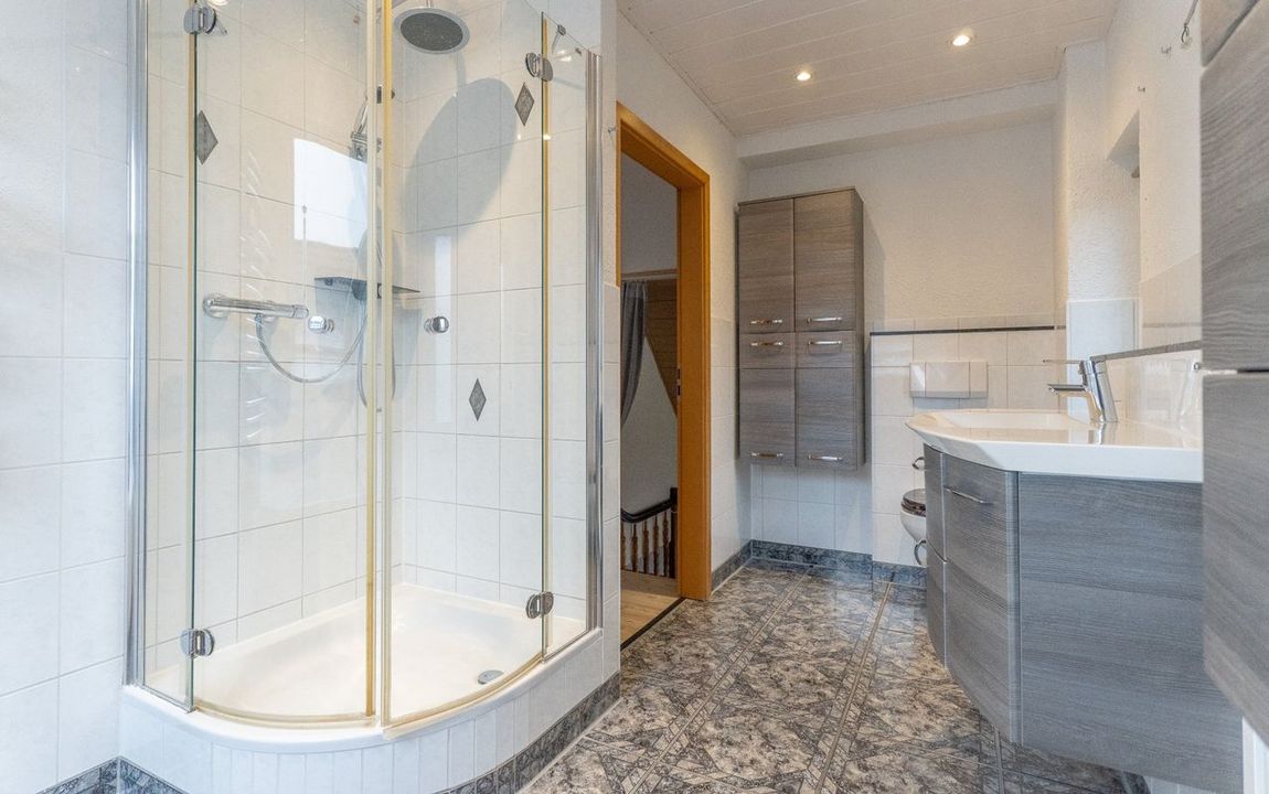 Von der Diele im 1. OG sind alle Räume dieser Etage zentral erreichbar. Linker Hand befindet sich das Gäste-Badezimmer mit Fenster und Dusche.