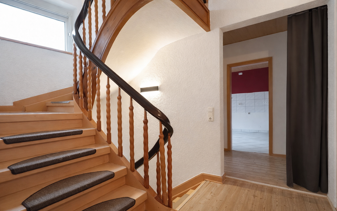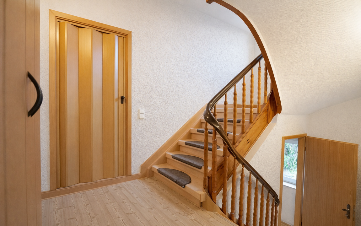Beim Betreten der Wohnung empfängt Sie ein Eingangsbereich mit Garderobe, Abstellkammer sowie Zugang zur Diele im 1. Obergeschoss und zum Treppenaufgang in das 2. Obergeschoss.