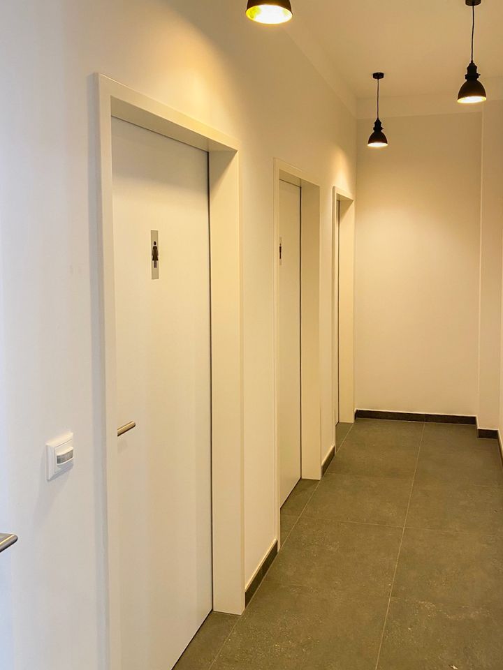 Das angrenzende Büro bietet ausreichend Platz für Verwaltung, Personalorganisation oder Kundenempfang. Das Angebot umfasst ebenfalls einen Sanitärbereich, WC- sowie Waschmöglichkeiten.