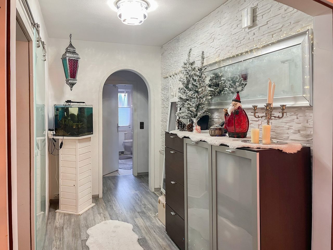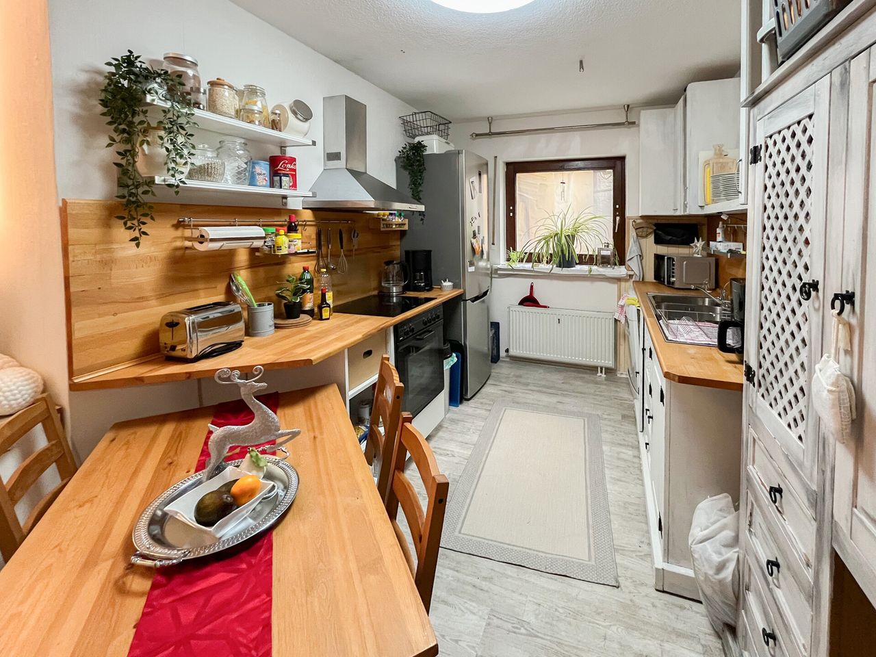 Im Erdgeschoss erwartet Sie eine gut ausgestattete Einbauküche, die offen in den Essbereich übergeht – ideal für gesellige Stunden. Ein komfortables Bad und ein gemütliches Schlafzimmer ergänzen den Grundriss. Das Wohnzimmer mit Kamin schafft besonders im Winter eine warme Atmosphäre und bietet Zugang zum sonnigen Balkon.