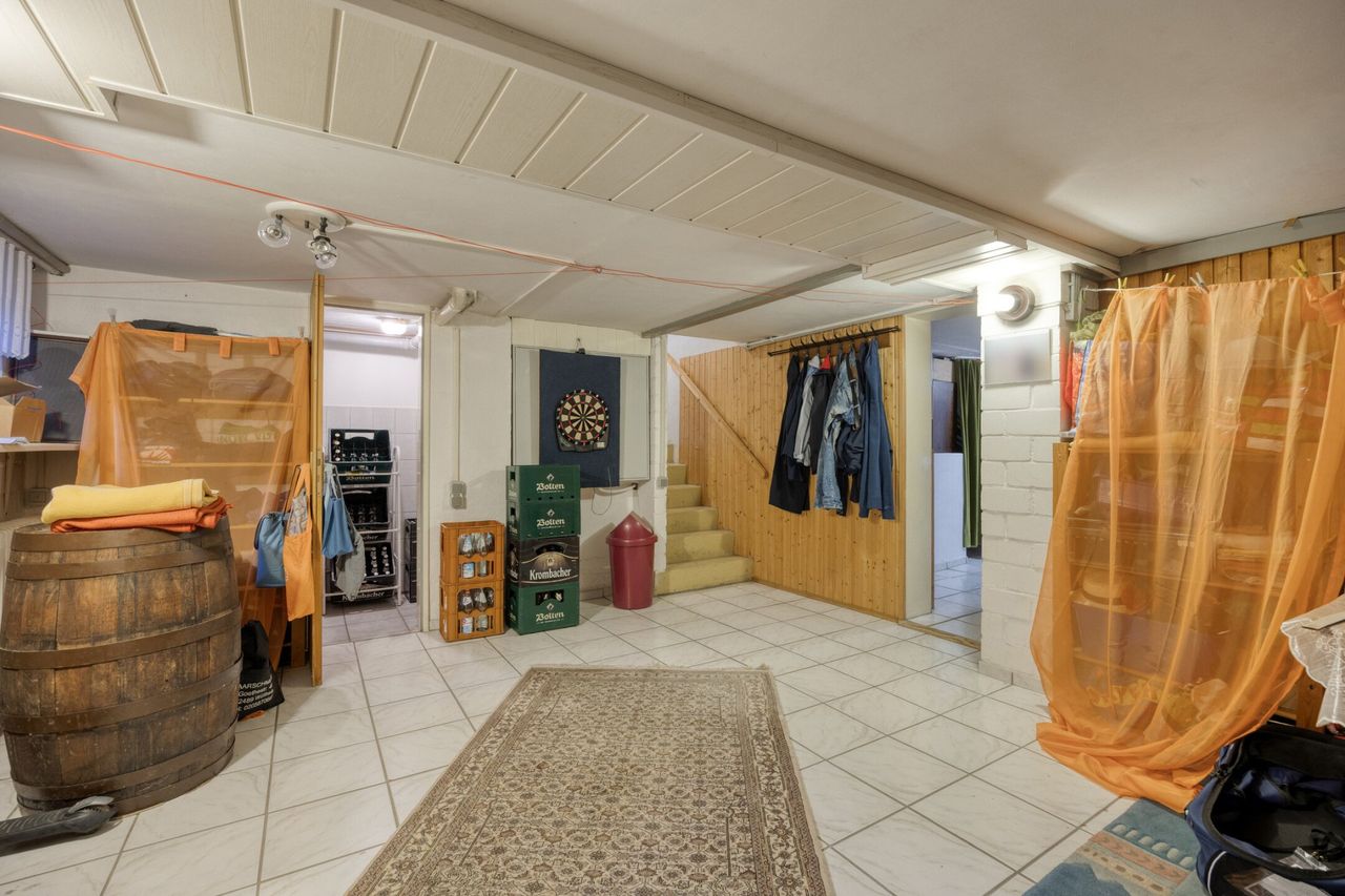 Mit insgesamt drei Badezimmern, großzügigen Kellerflächen sowie einer Doppelgarage bietet die Immobilie ein komfortables Raumangebot für Familien mit Platzbedarf.