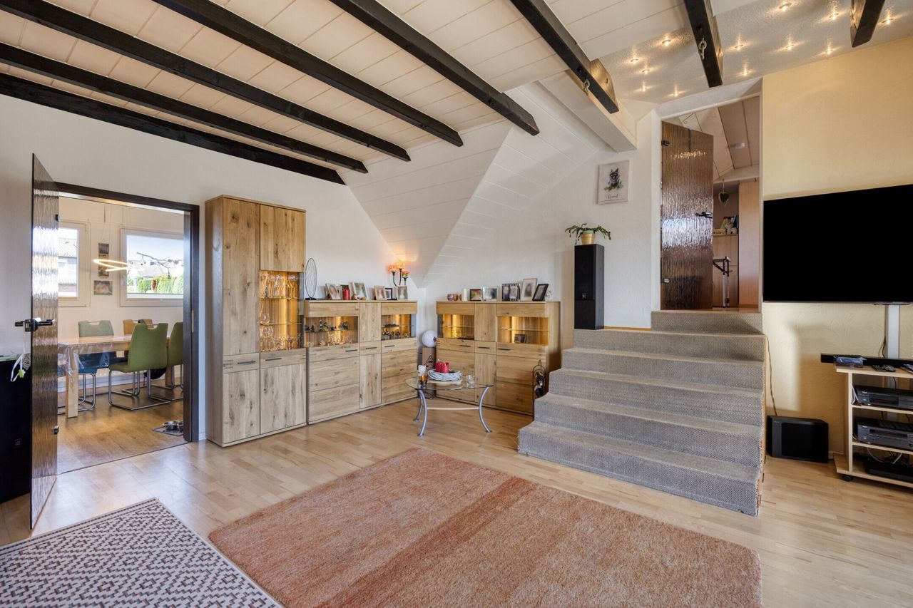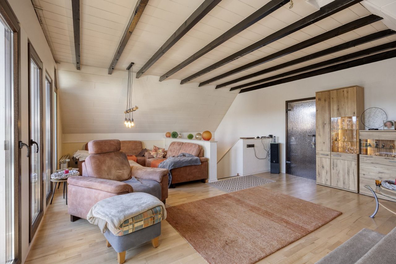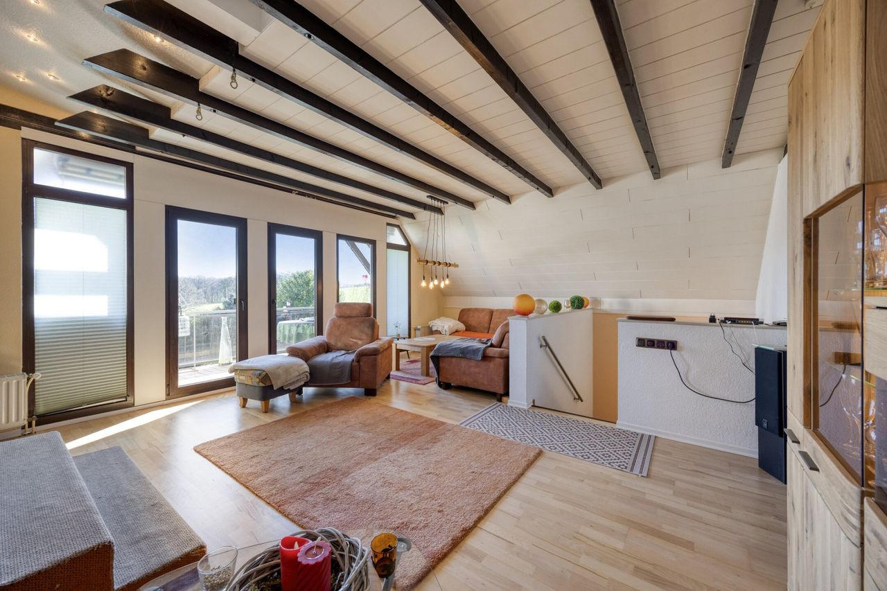 Besonders hervorzuheben ist der großzügige Wohnbereich im oberen Geschoss mit sichtbaren Holzbalken und Zugang zum Balkon. Von hier aus eröffnet sich ein weiter unverbaubarer Blick ins Grüne.