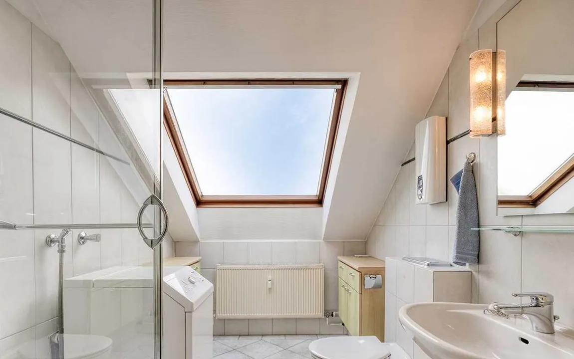 – weiß gefliestes Tageslichtbad mit Dusche