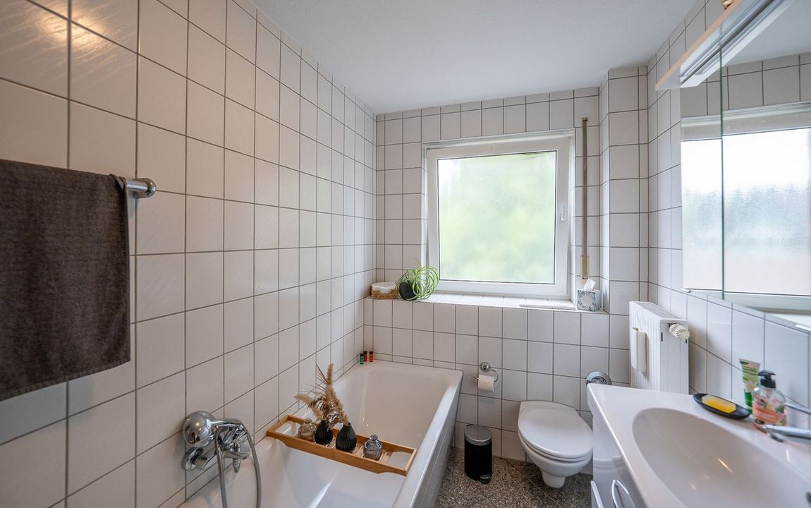 Das Badezimmer bietet mit Dusche und Badewanne alle Annehmlichkeiten für den Alltag – funktional und dennoch komfortabel. Moderne Kunststofffenster sorgen für viel Licht, eine gute Wärmedämmung und einen gepflegten Gesamteindruck.