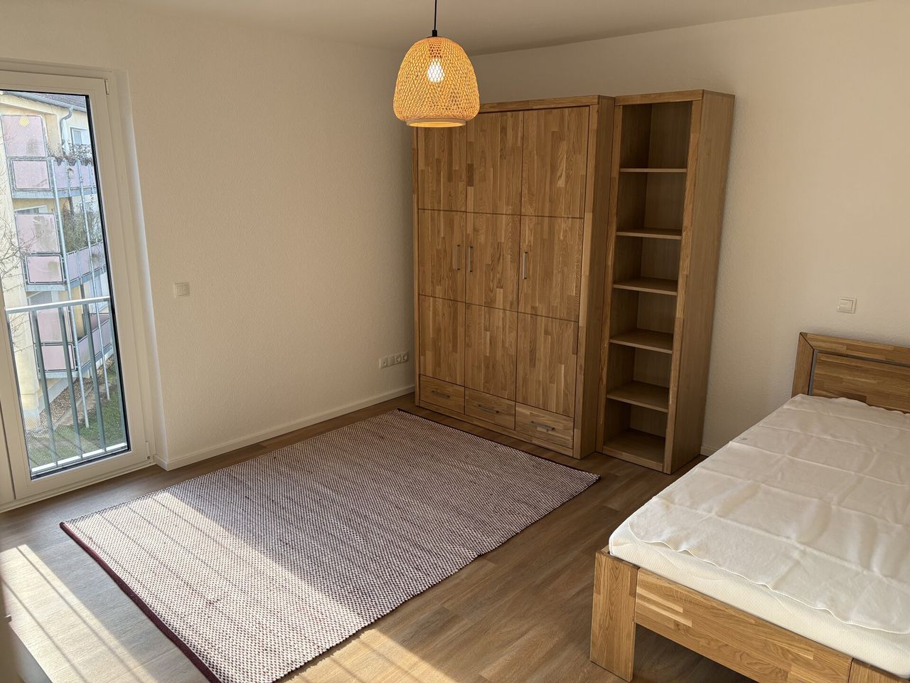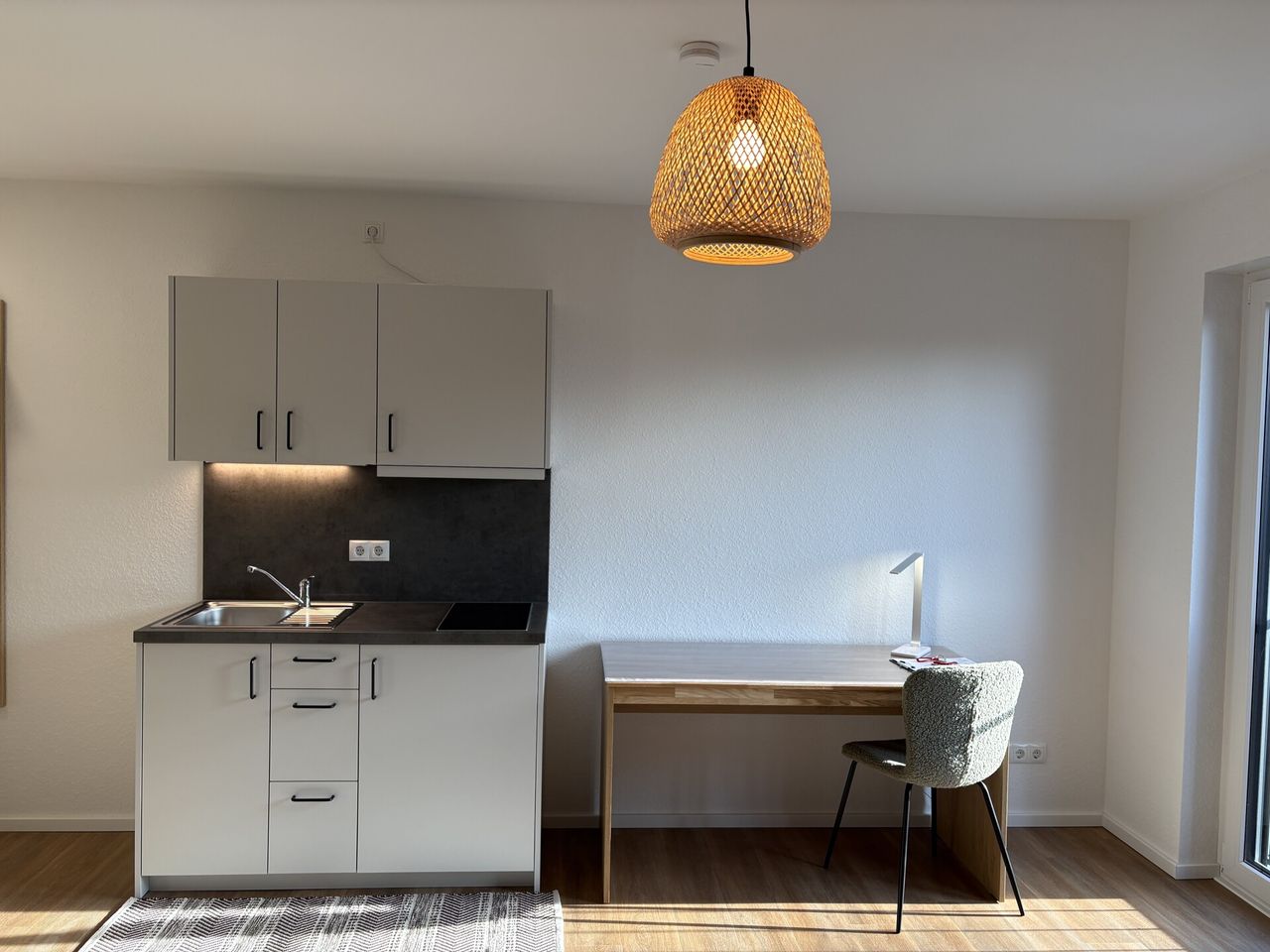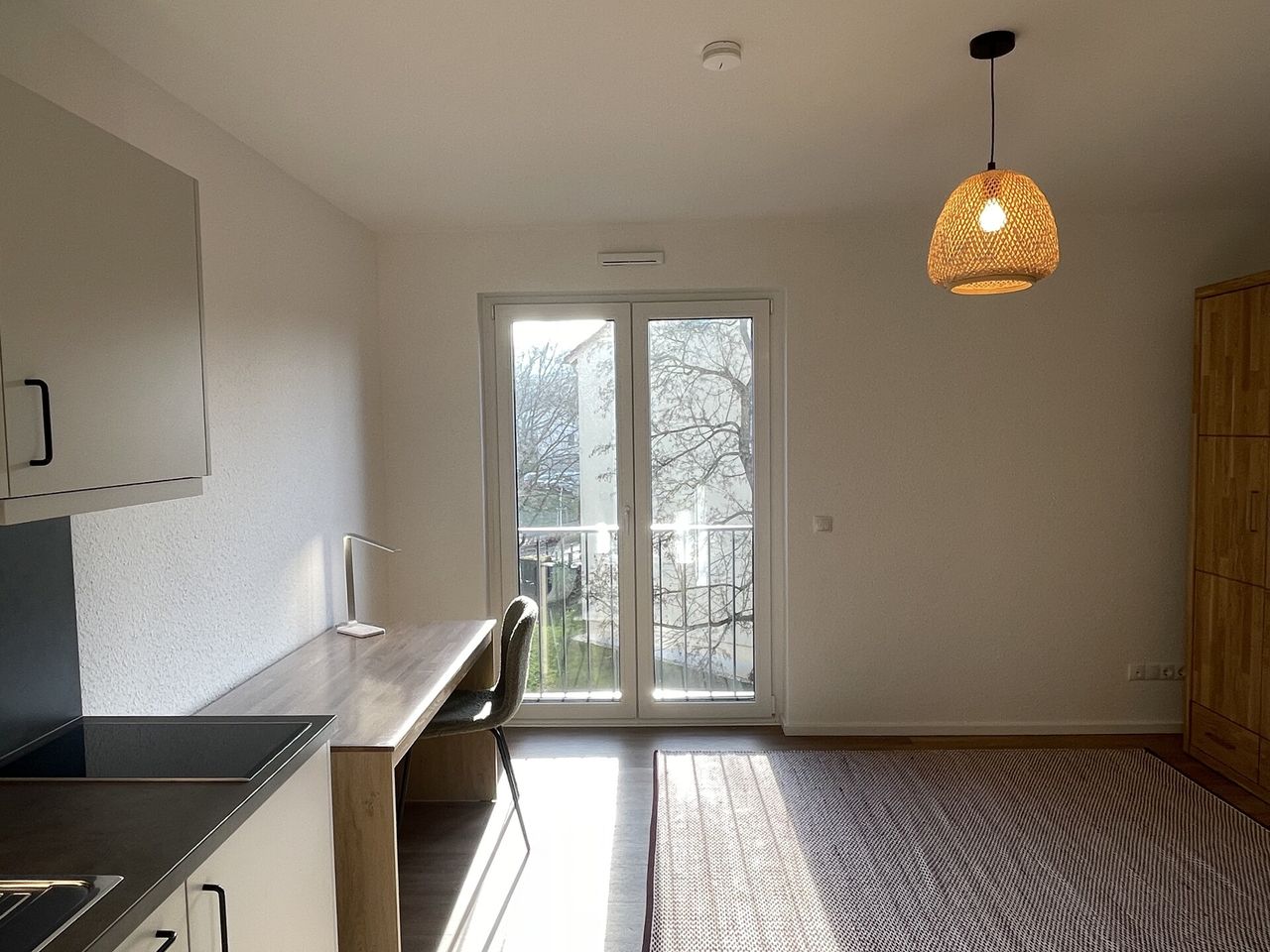 Die Wohnung ist vollständig möbliert und hochwertig ausgestattet mit einem Bett, einem Kleiderschrank, einer Garderobe, einem Schreibtisch sowie einem Stuhl. Hier heißt es: einziehen und wohlfühlen.