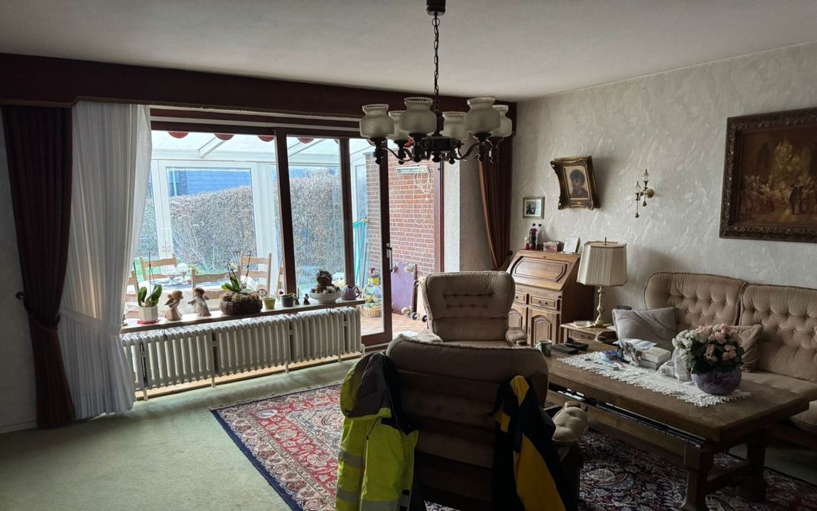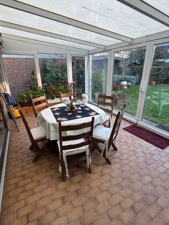 Eingangsbereich mit Diele, G-WC, Garderobe, Wohnzimmer und Küche und der angebaute, neuere Wintergarten (ursprüngliche Terrasse ist mit Genehmigung nachträglich unterkellert worden)