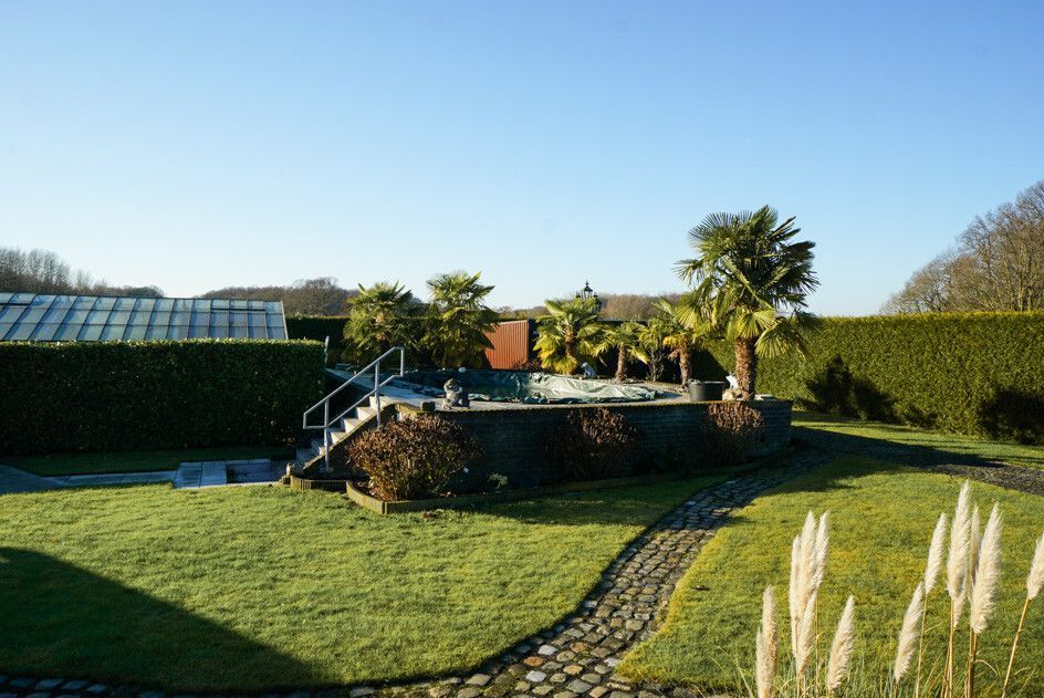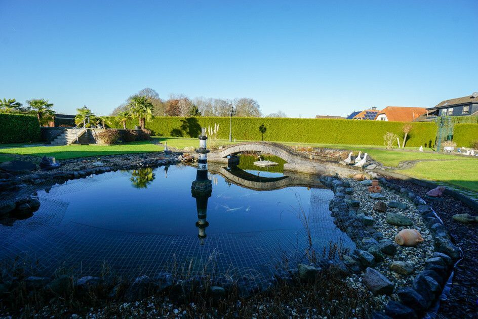 Die derzeitigen Eigentümer und Bauherren haben den Garten pflegeleicht, jedoch mit einem Koi-Teich, tollen Swimmingpool und Gewächshaus angelegt. Diverse Wasserzapfstellen über eine Ringleitung und Strom bieten entsprechenden Komfort, die umlaufende Hecke entsprechende Privatsphäre.