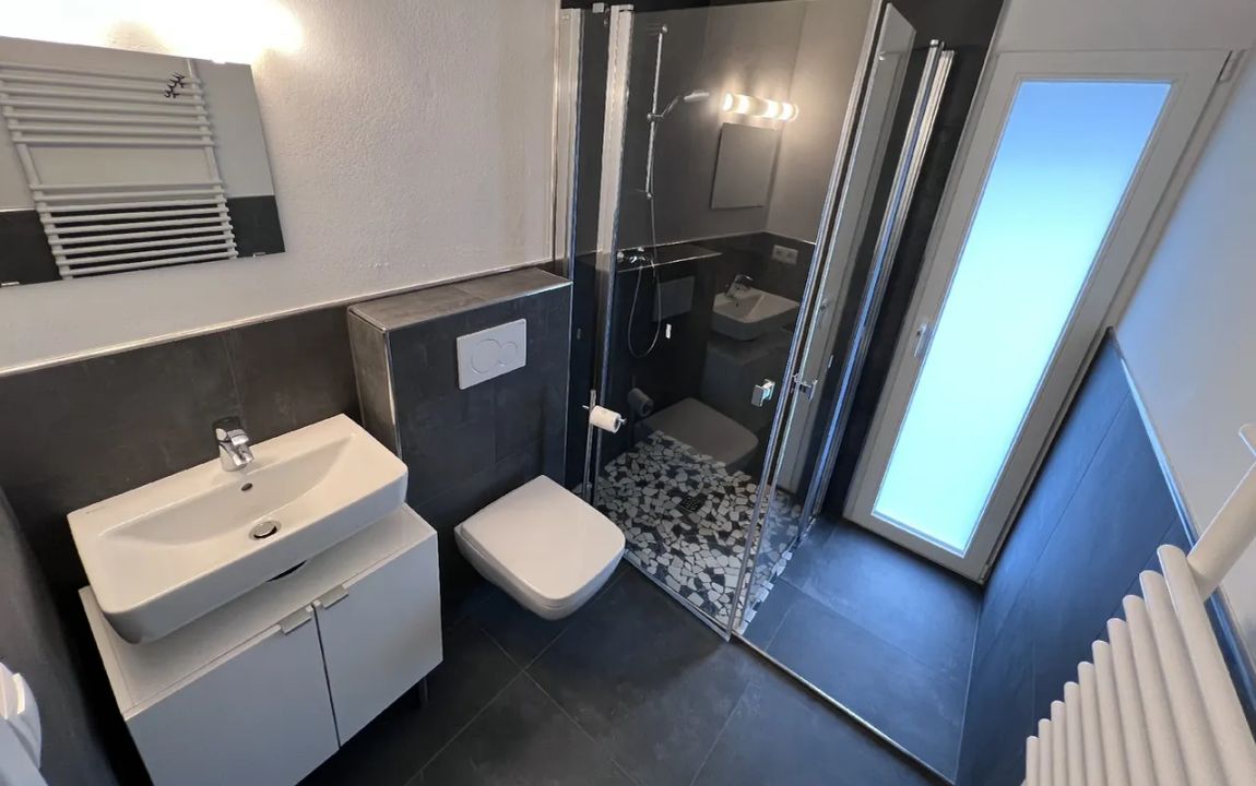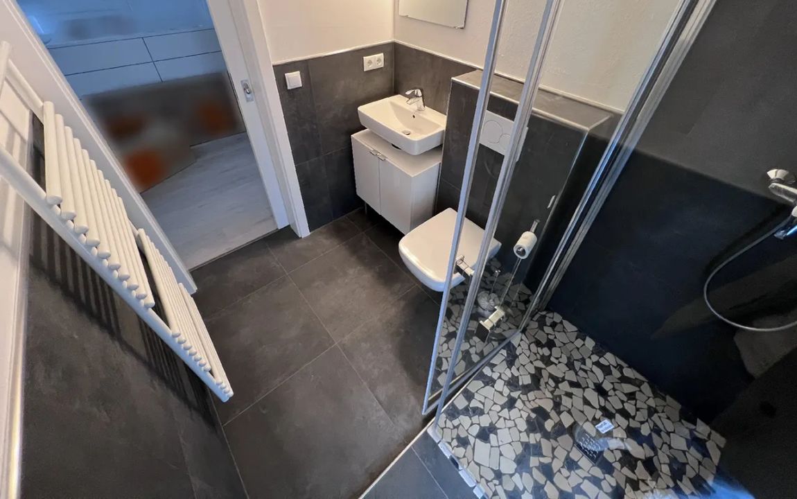 Das Badezimmer ist funktional ausgestattet und verfügt über ein Fenster, eine Dusche sowie ein Waschbecken. Die Küche bietet eine umfassende Ausstattung mit vier Cerankochfeldern, Backofen, Kühlschrank, Spülmaschine und Dunstabzugshaube und erfüllt damit alle Anforderungen des täglichen Bedarfs.