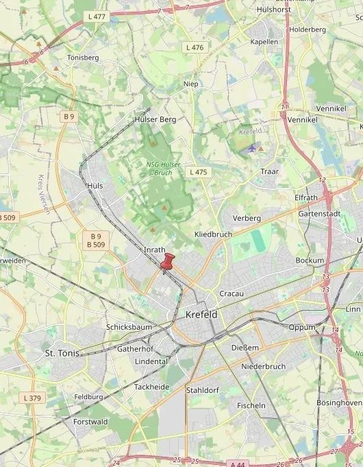 Die angebotene Wohnung befindet sich im Stadtteil Inrath, am Rande des Krefelder Zentrums. Sämtliche Einkaufsmöglichkeiten für den täglichen Bedarf sind mit dem Auto in wenigen Minuten erreichbar. Das Gewerbegebiet auf der Mevissenstraße liegt nur wenige Fahrminuten entfernt. In der näheren Umgebung befinden sich außerdem diverse Schulen sowie Grünflächen, welche zu langen Spaziergängen einladen. Die nächstgelegene Bushaltestelle Schroersdyk liegt ca. 450 m entfernt. Von hier fahren die Buslinien 076, 077 und 079. Zur nächsten Autobahnauffahrt der A57 gelangen Sie in ca. 10 Fahrminuten.